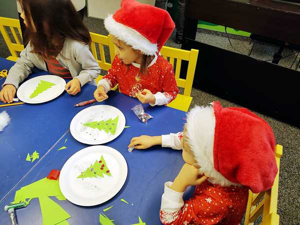In the first room they had two piles of adult clothes and a picture of Rudolph without his nose on. The kids had to put the clothes on, then turn around a few times and put Rudolph's nose in the right spot. Tammy went first, then Emmy. Then we moved on to the next room. That's where they had the crafts going. I helped them cut the Christmas tree out that they then glued to a paper plate. Then they got to glue stones and glitter and snow on it. They were soon done, and we moved on to the next room.