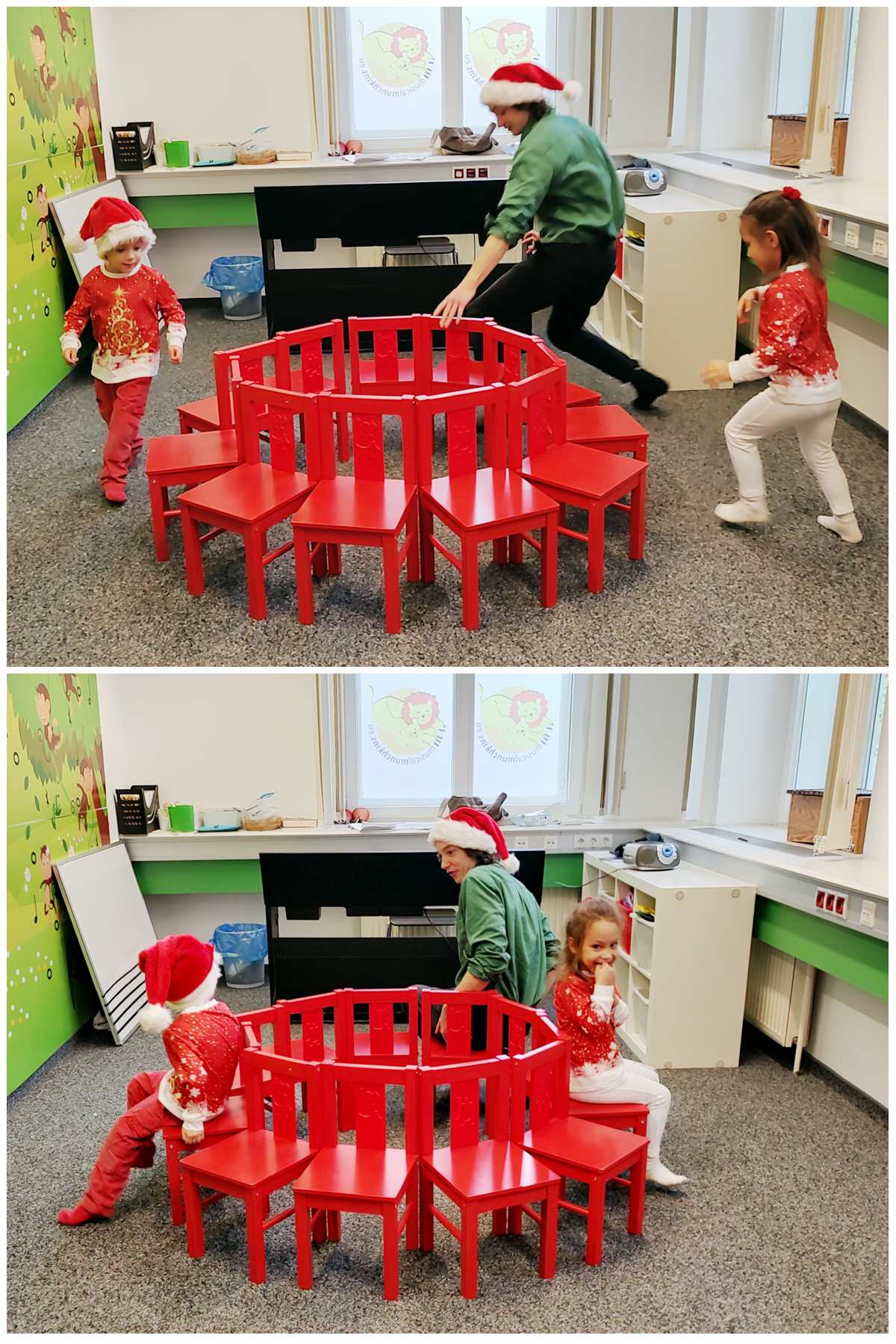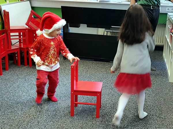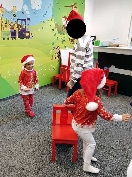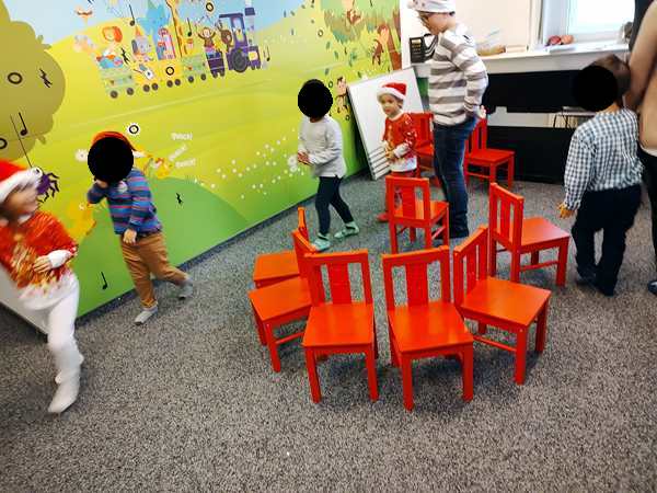 After a few rounds of playing musical chairs, we left the room. We had finished all the activities and went to the main room. The kids had some cookies on the way. They had the cubes in the room that the kids were playing with, while others, and adults, were sitting on them. I sat down on one with Sammy. Emmy and Sammy were hugging each other, which was sweet. Their piano teacher was the one playing Christmas songs non-stop in the room, but she never actually talked to them at all, just gave them a greeting nod.