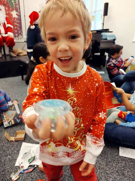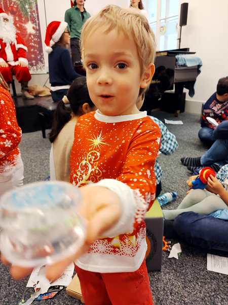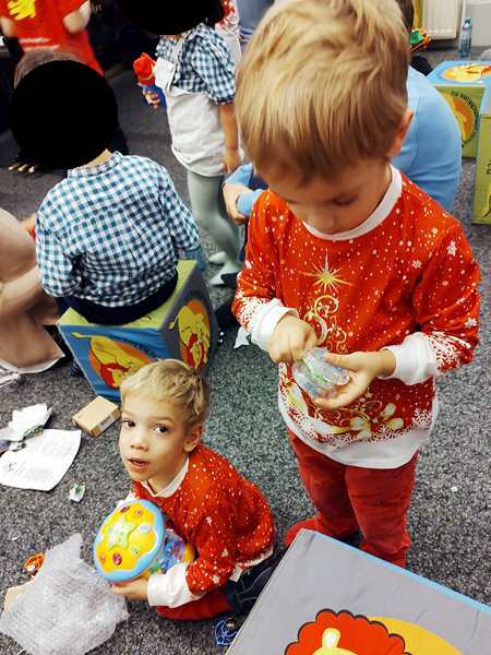 Sammy's box was bigger, and I helped him open it. When I took it out, his eyes lit up after I had turned it on. It was a toy with sound, movement, and lights that were projecting out. The perfect gift for Sammy! He loved it so much, he held it tight and wouldn't let go of it.