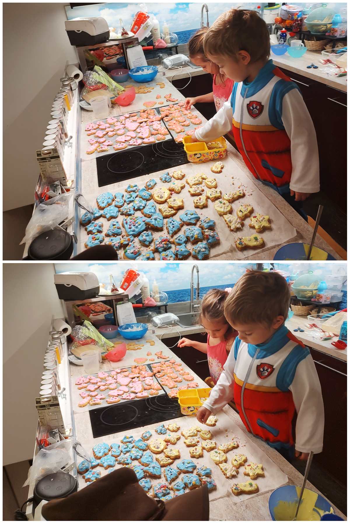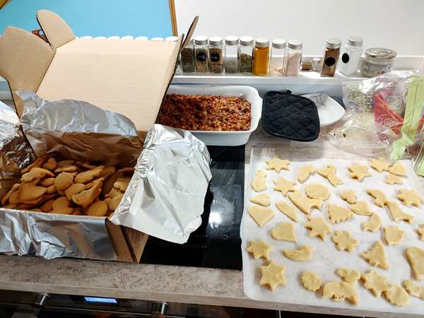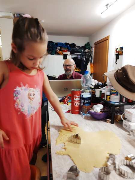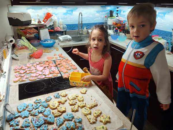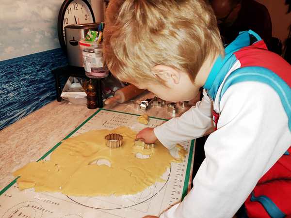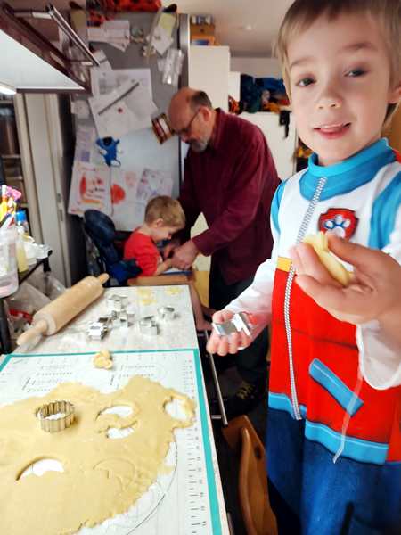 At some point I also got up and started making a pasta casserole for lunch, which was the best decision. Once it was in the oven, I made the cookie dough - 2 kilos of baking mix, 4 eggs, 600 grams of butter and water. There was really nothing the kids could do, while I was kneeding the dough together. It then had to rest in the fridge for an hour. That gave me a little time to do other stuff.