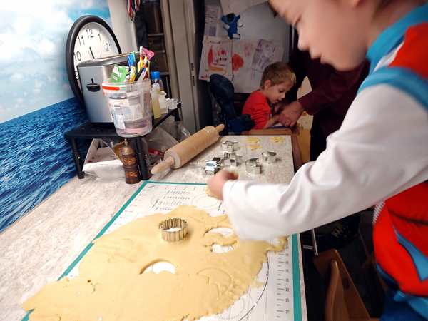 Next came the colors. Tammy chose to start with pink, and Emmy with blue, both their favorite colors. We put a few drops of color into small bowls of icing sugar, and they stirred them into until it was a beautiful, consistent color. I was then the one to apply the icing to the cookies, while they added the sprinkles. I was barely fast enough to keep up with the demand. Randy had already left to go pick up second-hand ice-skating shoes for me, so I was alone with the kids. Sammy was on the floor near us and stood up to watch us, but I really had no time to do anything with him. There were a lot of cookies to decorate. Emmy put so many sprinkles on them that I ran out at the end. He then chose yellow as his second color, and Tammy red. By the time they were done with those, they were done altogether, even though there were still cookies to decorate. Randy had returned, so all the kids went downstairs with him. Sammy had been whining and calling for Daddy for a while and was really happy, when he returned.