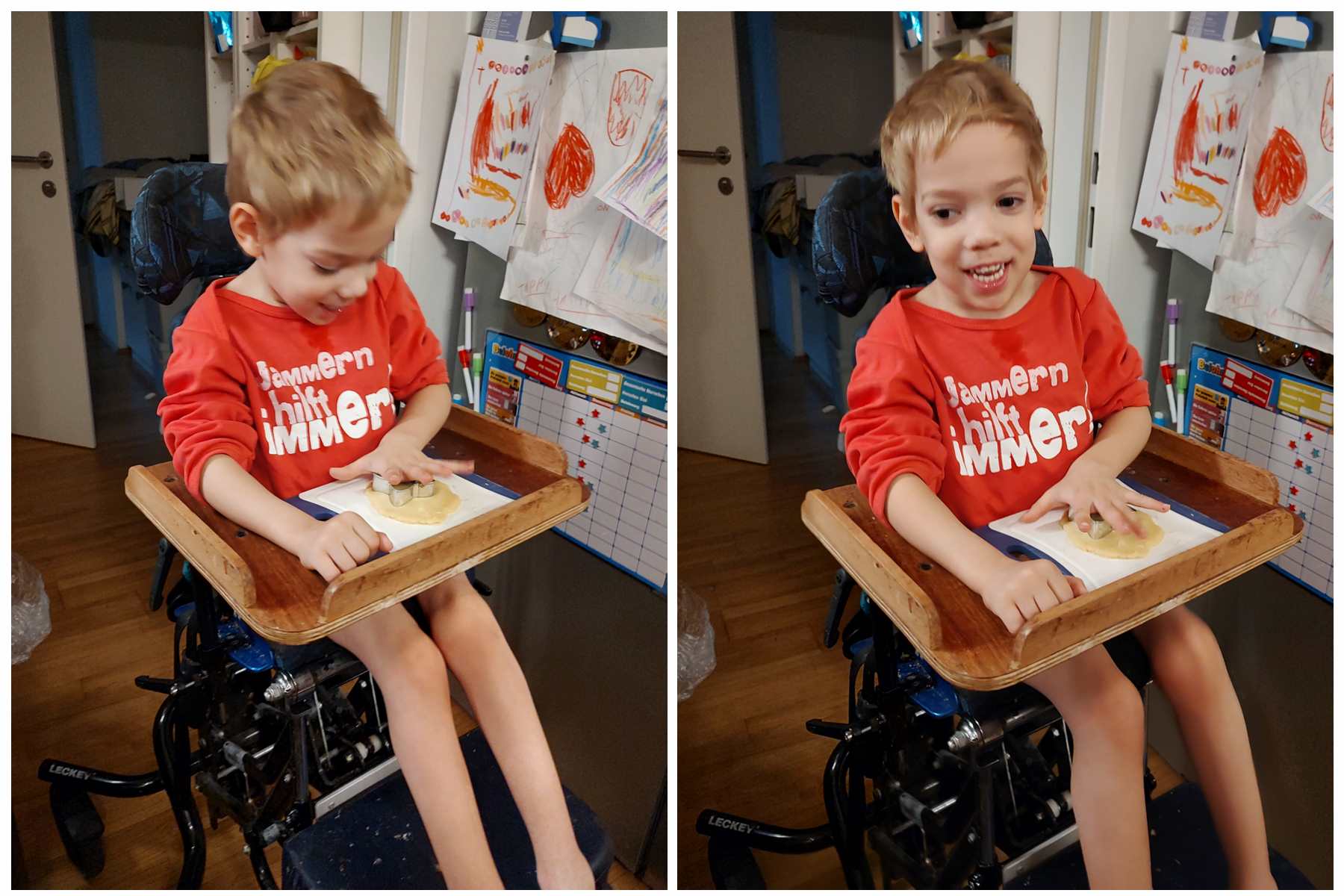 Then I got the casserole out and started roling out the dough. It was time for the kids to spring into action. They moved their chairs to the kitchen to be higher up, and Sammy went into his special chair that had a tray. And then I was pulled into 3/4 different directions, as nobody had any patience. It was rather stressful for me. I rolled out dough for Emmy on one side of the kitchen, dough for Tammy on the other side, and then gave Sammy some. I also moved the cookies to the baking paper and tray to go into the oven. I think we had about 5 trays that went into the oven consecutively. We were so busy that time went by fast. When I could look at the clock for the first time, after having finished, it was already 12:30. I was glad the casserole was sitting there, just waiting for us to eat it. And so I dished it out, and we all sat down to eat.