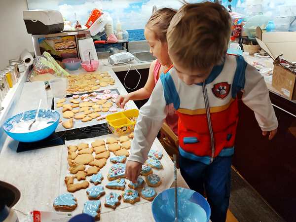 I took care of the kitchen after lunch, while the kids got on their tablets. Then I finally got to sit down for a short period of time. But there was still lots to do. Eventually I got up to get everything ready for us to decorate the cookies. I had white icing sugar, and the kids were ready to spring into action again. I added the water to the sugar, then it had to be mixed with a hand-mixer for 10 minutes, which is quite longer. First Tammy held it, then Emmy, and they were doing a great job. The sugar turned out great, with a beautiful, shiny, white color.