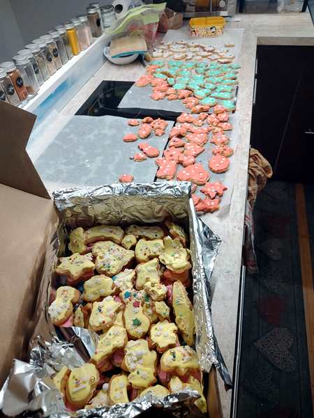 While they were downstairs, I mixed up a green color and continued decorating cookies, then used up the rest of the icing making the cookies white. And then the icing sugar was gone, but there were still cookies left. I put them all in a box, and Randy and the kids had the chance to try them, and they liked them.