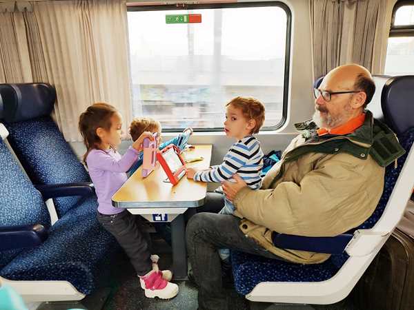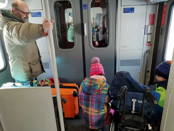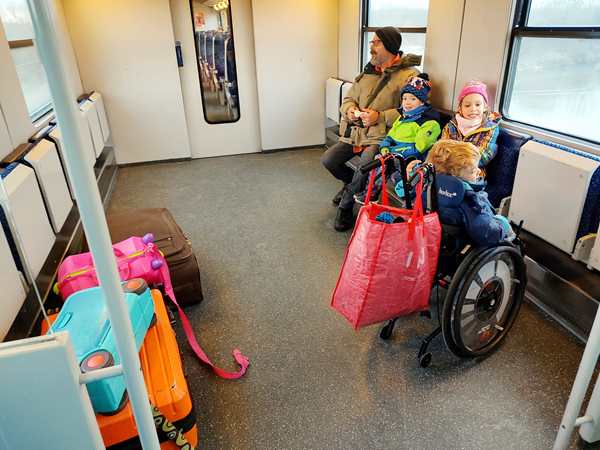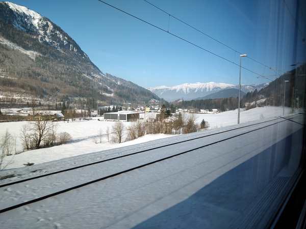 There was still another train sitting there, so we had to wait. It was really cold and Tammy was whining. Not long after the train had left, our train pulled in, and we got on. It was pretty empty again, like last year, and we occupied two tables with two seats on each side each. We had a 4-hour ride ahead of us, but thank God, it was a direct ride to Schladming, which is why we were on this specific train. All the kids turned their tablets on right away. It was also Sammy's second day of being sick, and he wanted to be with me the whole time. And so I had him for most of the time. He was either resting on my chest or sleeping there, or sitting next to me. The other two moved around and also had some fun together, but were watching or playing on their tablets for most of the time. Tammy was the most impatient, asking all the time, when we'd be there, and saying that this trip was taking so very long.