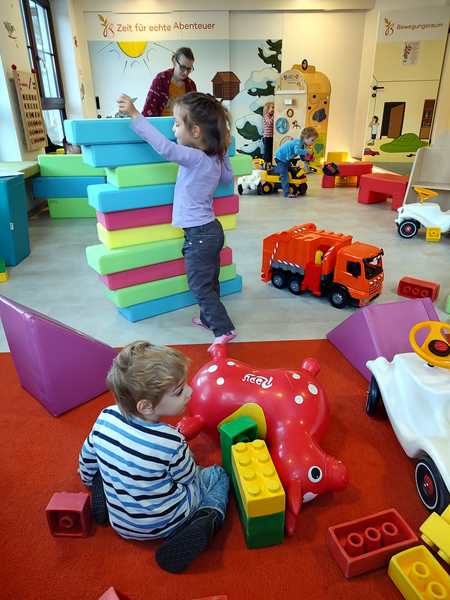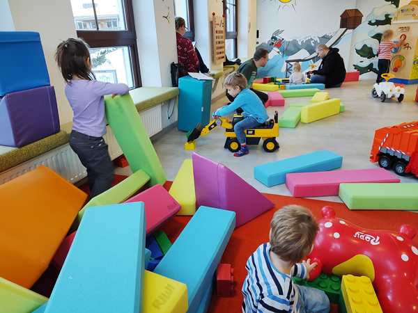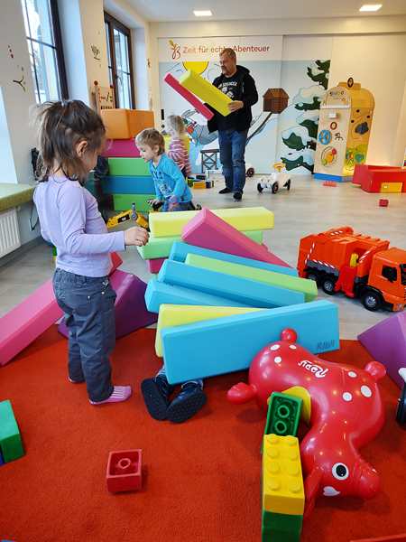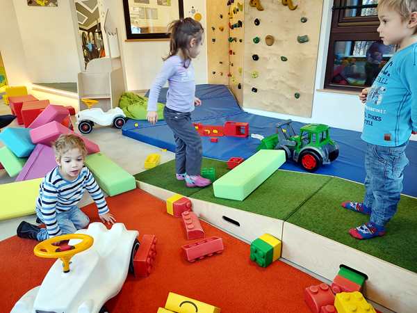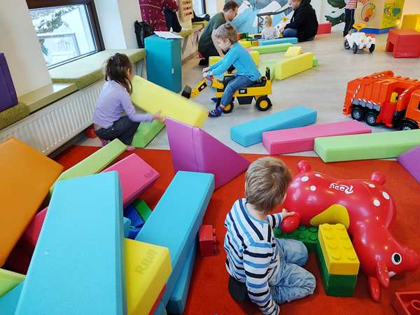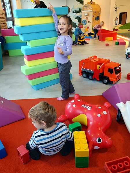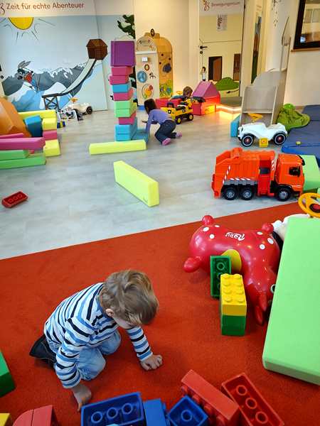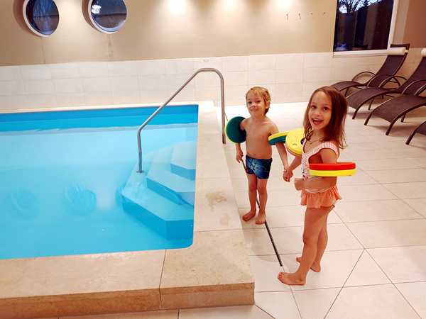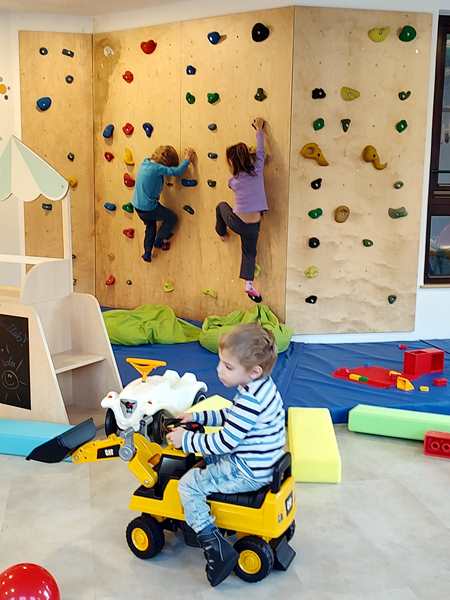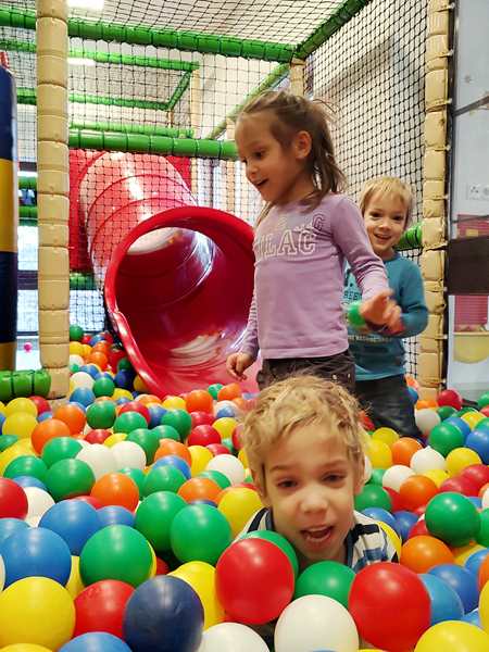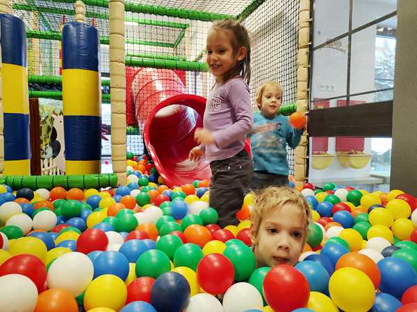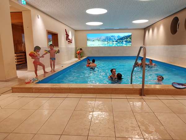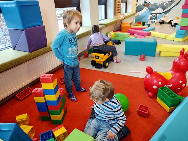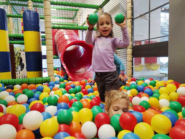 We went back to the play area and stayed there for about an hour. They were having lots of fun. They were getting hungry, as they hadn't eaten much on the train, and only the boys had eaten some of the bread with Salami. And so we returned to the room at 4 pm, waking Randy up. At 5 pm we had to see the ski school representative, so we had to keep that in mind. The kids were eager to go swimming, so I put all their swimsuits on, packed in a bag what we needed to take, and we left Randy to continue sleeping and get well and went to the pool without him.
