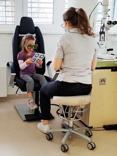 Tammy decided to go first. She put glasses on her face, where only one eye could see at the time, and had her try to recognize shapes from a distance. Then Emmy did the same. Then we returned to the waiting room and waited to be called in to the doctor's office. We didn't have to wait long. The doctor looked at Tammy's and Emmy's eyes through her machine, since the eye drops had done their work. Then she said that their vision was perfect - no glasses necessary. She said to come back with Sammy, when he's well again.