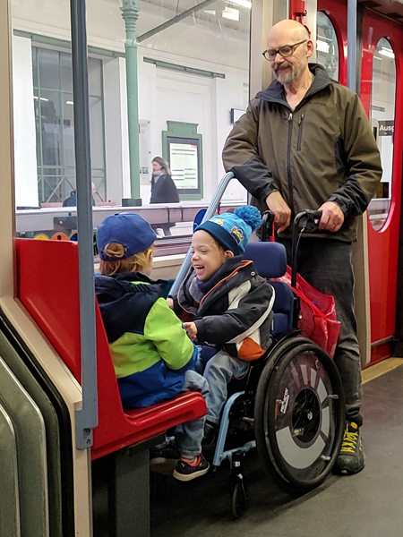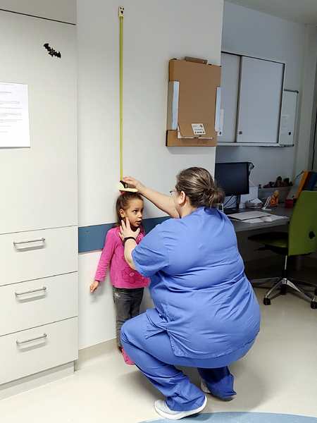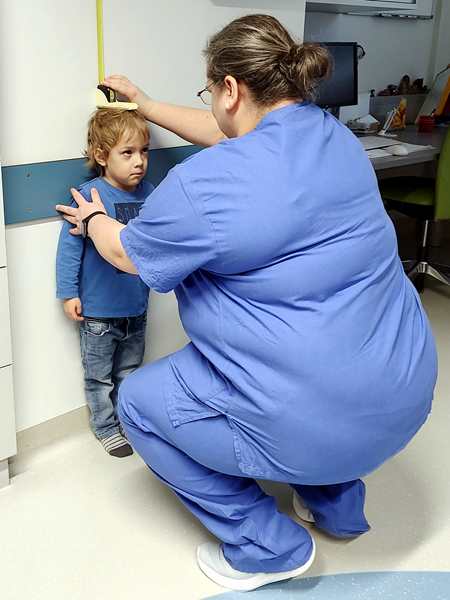 It was time for their yearly preemie checkup at the university hospital, where they were born. In fact, this time it was at age 4.5, while the 3-year-old check up had been around their biological age 3 mark (Nov 2022). Now they only have one more check-up a year from now, when they're 5.5, so just before they start school. We had to take three subways, and it was so fast this morning, that we got there quite a bit too early. However, we still had to register, which took some time. The one thing I noticed right away that it was the first time with no Covid measures whatsoever. There was no check at the door, and nobody was wearing masks. After having registered, we went to the familiar waiting area, where we were the only ones. I was surprised, when a lady came right away and said we could come for the measuring part of the check-up. Surprisingly it was Emmy who said he was going first; usually it's Tammy. They had a chair that was a scale, where they weighed him, then measured his head circumference, then took his blood pressure. Next she took him to the wall to measure his height, then it was Tammy's turn. Sammy went last, and he did great as well.