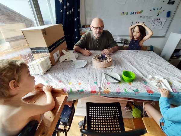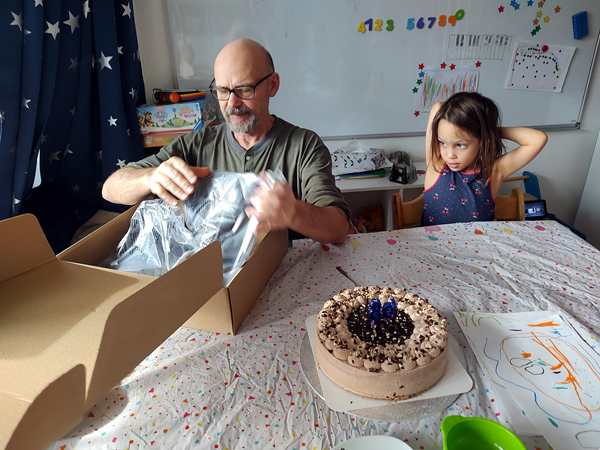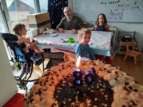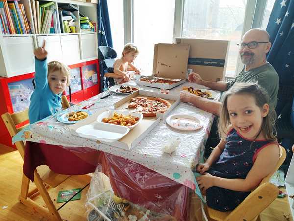 Day 1629. Tammy now sleeps most of the night between us in our bed. Last night she was really restless, moving all the time, and then Emmy came and left a few times as well. As as result I was awake way too much after having gone to bed late. And so I was really tired this morning. Randy got up at some point to make breakfast for the kids, while I had set my alarm for 8:30, as I was teaching at 9 am. It was hard getting up, and I was still very tired, when I started teaching. I then taught for two hours, while Randy and the kids were downstairs, where they were playing. After I was done, they came upstairs and Randy went to the grocery store. He had about an hour, as the food delivery was supposed to arrive by noon at the earliest. And they were very ponctual. As Randy wasn't back yet, we waited for him. Then we unpacked it all and put it on the table that I had put a birthday tablecloth on. Spareribs, wings, chicken nuggets and pizza. Everyone got to eat what he liked.