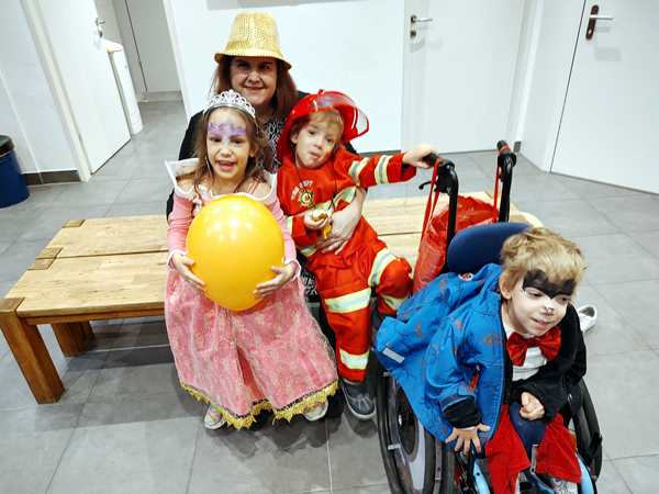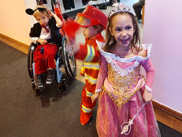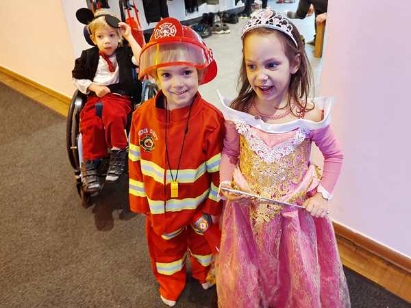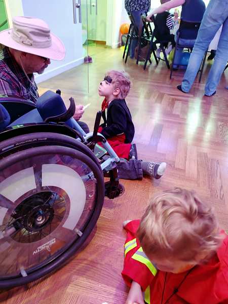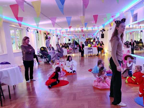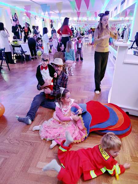 The kids had gone to a weekly dance class there all of 2022, but we hadn't been back sinde. However, I still get their emails, and when I saw the info about the party, I decided it would be nice to go, as there was no other party today that we knew of. After we showed our tickets, we found out that they actually had an elevator that Randy and Sammy could ride up on. I walked up the stairs with the other two. There were already a lot of people and children there, in the big dance hall. They had set up tables, but we didn't have any seats as those were an additional expense.