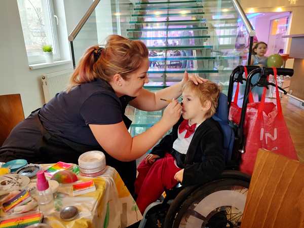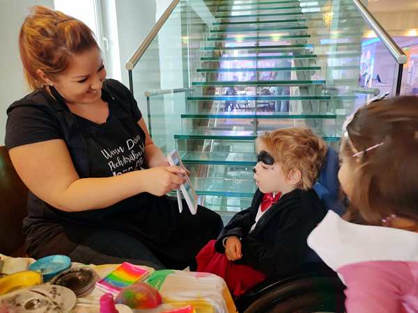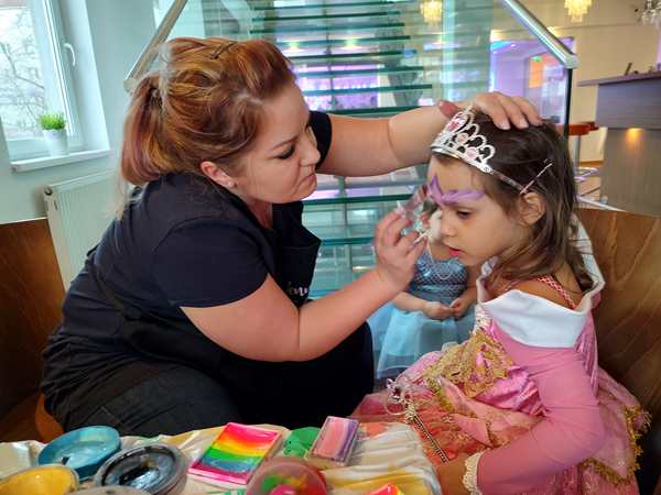 We then saw the face-painting station and stayed there, lining up patiently so that our kids could have their faces painted. It took a while, and one of the dance teachers tried to get us to come to the room, as they wanted the kids to participate in the games there. We still stayed. And then it was our turn. Sammy went first, and she painted Mickey ears and a nose on his face. He had no issue with it at all and did great. Tammy came next, and she wanted to look more like a princess. Emmy came last. What do you paint on a fireman's face? She said she couldn't do a firetruck, so she ended up painting fire.