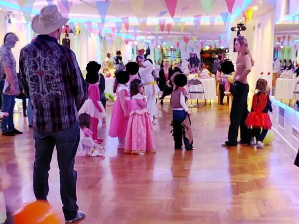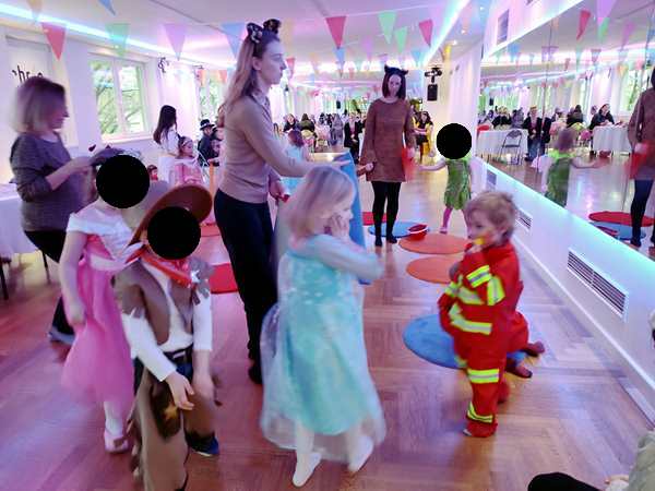 Then we went inside the dance hall, where the teachers were already doing children's songs/dances with them. A few kids were really participating all the time. Our kids were not that interested. They participated in some, and later it was only Tammy who joined the dance. They did participate in the games, though, like musical chairs with little carpets, or the freeze game.