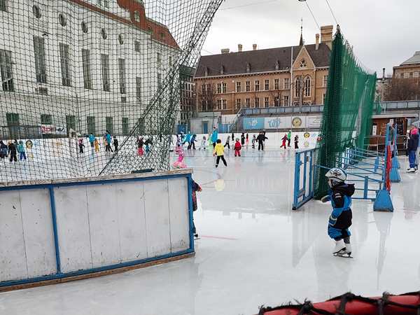 And so we left at 3:40 pm to take two subways and go to the ice-skating rink. We put their shoes, gloves and helmets on and walked to the school area. It was a warm day with 16 degrees Celsius, and so the ice was covered in water. Emmy was not complaining or saying he did not want to go on the ice. I was surprised and impressed. When we reached the school area, they simply walked onto the ice and joined their class that had just started. However, he only stayed on the ice very briefly, before he came back off and walked to us. He said he wanted to drink, drank some, and returned to the ice. A few minutes later he came back again. This time he said his belly was hurting and that he couldn't ice-skate. So he sat down with us to watch Tammy. Emmy returned to the ice one more time a little later, only to return rather quickly again.