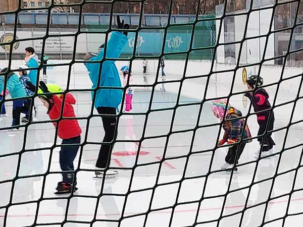 And so we left at 3:40 pm to take two subways and go to the ice-skating rink. We put their shoes, gloves and helmets on and walked to the school area. It was a warm day with 16 degrees Celsius, and so the ice was covered in water. Emmy was not complaining or saying he did not want to go on the ice. I was surprised and impressed. When we reached the school area, they simply walked onto the ice and joined their class that had just started. However, he only stayed on the ice very briefly, before he came back off and walked to us. He said he wanted to drink, drank some, and returned to the ice. A few minutes later he came back again. This time he said his belly was hurting and that he couldn't ice-skate. So he sat down with us to watch Tammy. Emmy returned to the ice one more time a little later, only to return rather quickly again.
