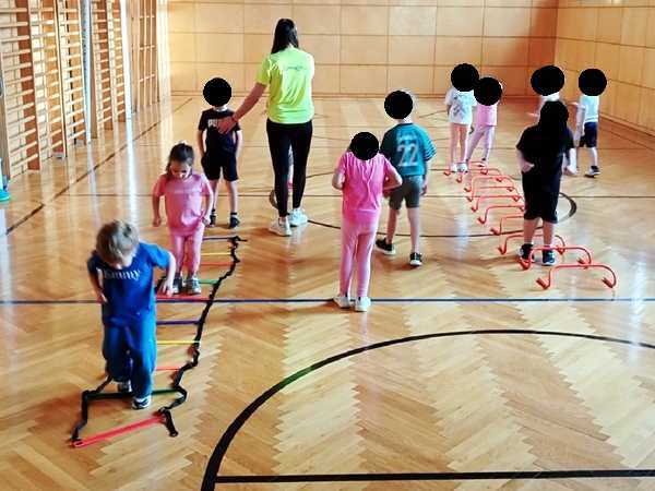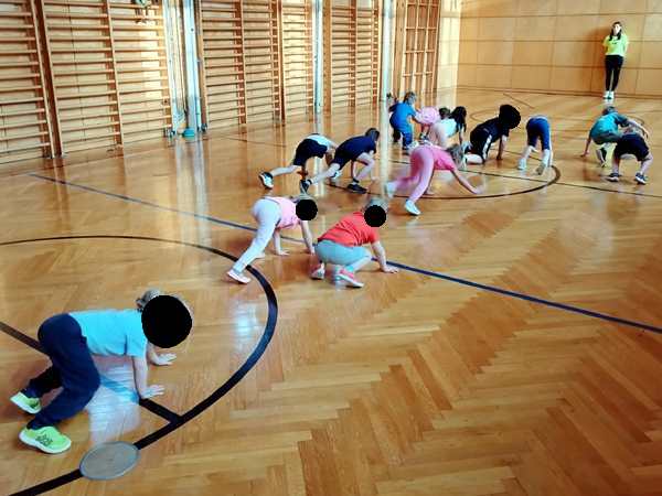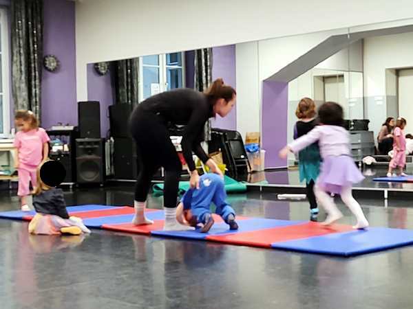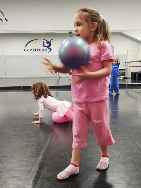 At 4:30 their class started. There were not a lot of children there and still no boy, even though we'd been told there was one other boy in the class. The teacher greeted the kids, then did a warm-up with them. Emmy came to me a few times, and I kept encouraging him to go back. At least his belly wasn't hurting. After the warm-up, and doing the ballet positions, they did some running and jumping with their arms in different positions. They also had to jump over mats.