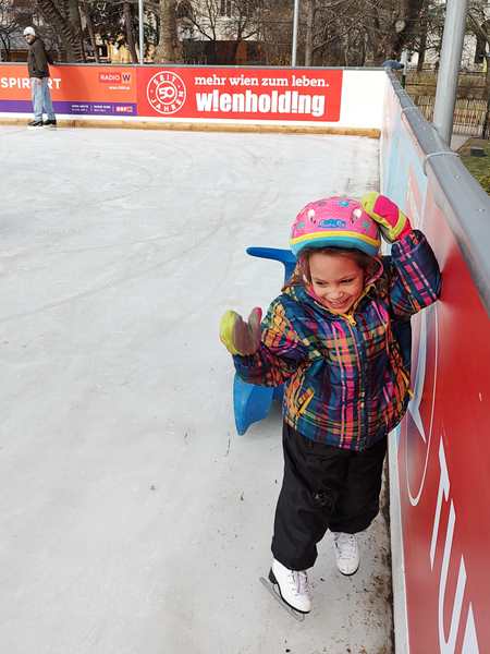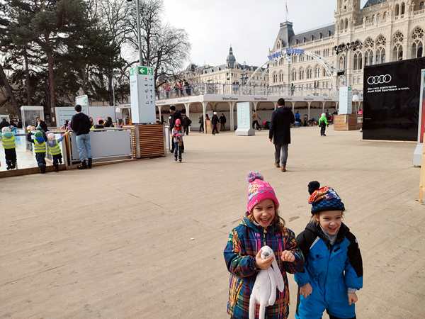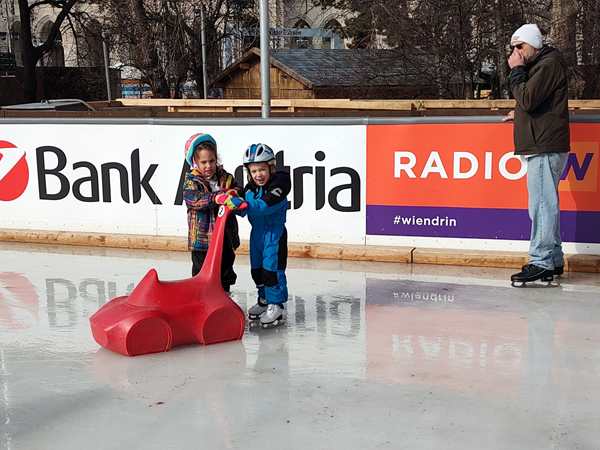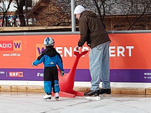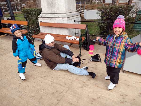 It was nearly 9:15 am, when we left the house together. Half an hour later we walked on Town Hall square. The ice was empty, and the free kids' area was cordoned off. I walked up to an usher and asked about it, and she informed me that it all opened up at 10 am. What a relief! We found a bench nearby and started putting our shoes on, which takes some time anyway. I was glad that Randy's shoes fit, as he had never tried them on before.