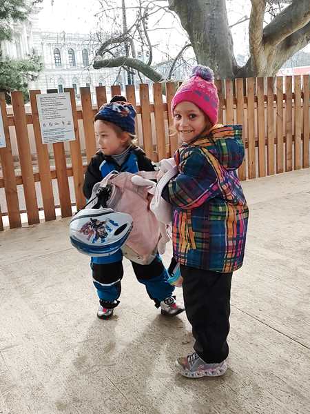After a while we'd all had enough and decided it was time to go home. We're hoping to come on Sunday, when it's the last day, so Sammy also gets a chance to ice-skate at least once this winter. Once we had packed everything up, Emmy and Tammy grabbed the bag with their shoes, helmets and other equipment, showing how strong they were, which was fun and cute. Randy then took the bag from them.