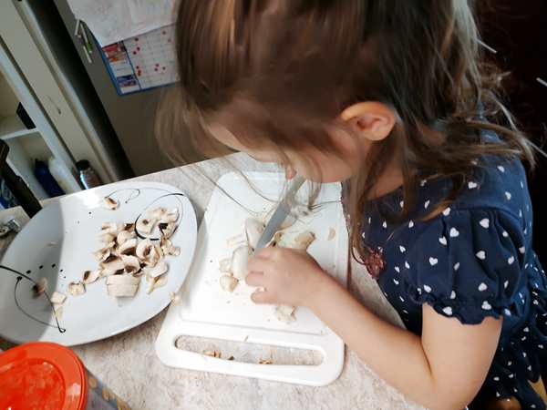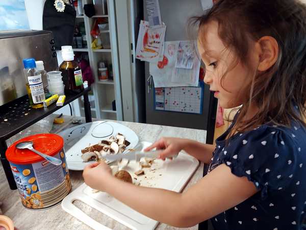 Tammy's tablet ran out of juice and she then ended up with me in the kitchen helping me cook. I gave her a few mushrooms to cut into slices, and she did a great job.