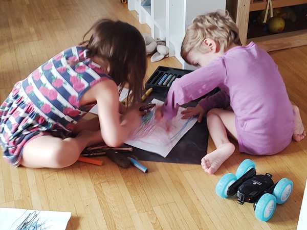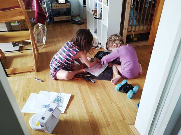 Day 1650. Yesterday we had a day at home. Sammy went to kindergarten in the morning, and I had a student. In the afternoon, the kids always go downstairs to play at some point. Before that was the case, Tammy wanted to do some drawing, and she included Sammy, encouraging him to draw with her. I was working on my computer closeby and enjoyed listening to Tammy talk to her brother and the two of them interact. I made a little video of the two of them. Then they all went downstairs, while I taught for 3 hours, from 3 to 6 pm.