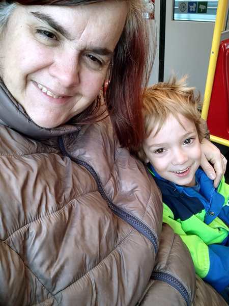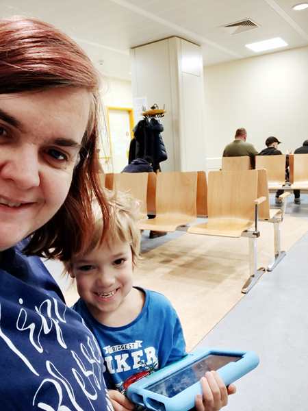 And so I had to get up at 9 am, got him and myself ready, and we left the house to go to the nearby hospital, while Randy and the other two went downstairs to play. The first picture I took in the subway on the way there. Emmy was in pain, and but it wasn't so bad that he was not in good spirits. As it was Saturday, there were not that many people in the hospital. We went to the kids' emergency room and registered. It was 10 am. Then we sat down. A few minutes later we were called into the first room, where they asked basic questions to find out what the problem was and determine which doctor he'd be sent to. We returned to the waiting room and sat down to wait until Emmy's name was called. He had his tablet with him, while I had my phone and a few papers to read. The second picture I took while waiting. I expected to wait about 2 hours from our experience in the past, but we ended up waiting for just over 3 hours. I had a few squeezies and a cereal bar with us for Emmy, which he ate. We were both getting pretty tired of waiting, and the waiting room was emptying out.