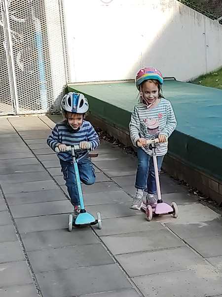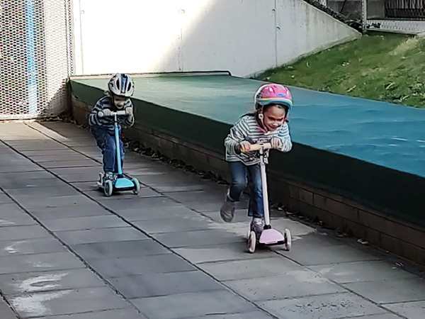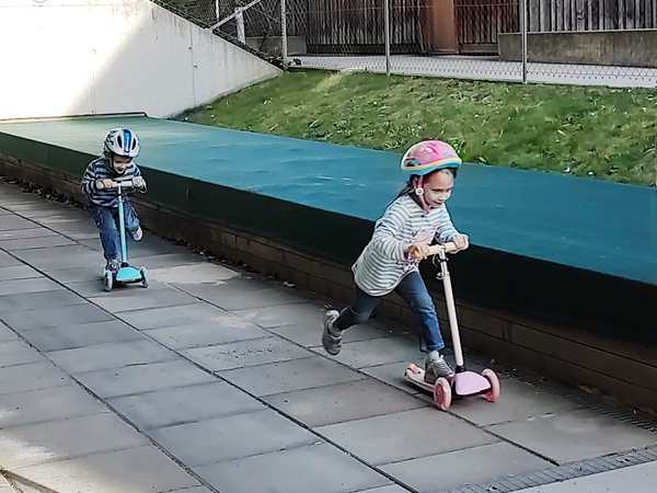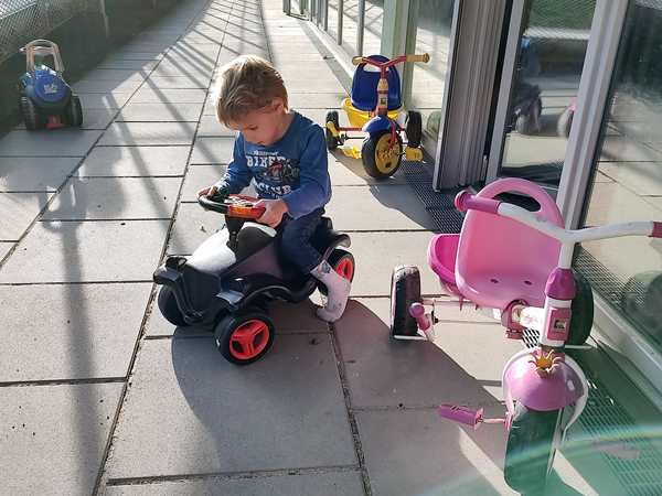 We walked back to the mall and got on the train that took us to the subway that we took home. It was the first warm day of the year, and the kids took their coats off, when we got off the subway and ran, enjoying the sun and the warmth. By 3:20 pm we were back home, but the kids were ready to go outside and run their scooters. I was very tired and just wanted to lie down, while being very much aware of the office work that's waiting to get done. Sammy was still quiet and looking tired and didn't care about anything. I then went downstairs to help them go outside and took a few picture of them having fun with their scooters. I put Sammy on a bobby car, but he didn't really want to be there but wanted to go back inside, so he did. The other two had fun outside for quite some time before coming back inside. And then they all came upstairs rather early. Sammy went to bed and fell asleep and has been sleeping ever since, probably since about 5 pm. The other two were on their tablets, then I started making their dinner at 6:15 pm. They ate at the table, then their fruit in the bathtub, then we got them ready for bed. I read them a bedtime story, then they brushed their teeth and we lay down in my bed, where I prayed for them, then stayed with them for a little while. After a few minutes I carried Emmy to his bed and went to the kitchen to make my salad. Then I carried Tammy to her bed and sat down to eat. After having eaten, I went back to work. Now it's going on 1 am, and I still have to take care of the kitchen before going to bed.