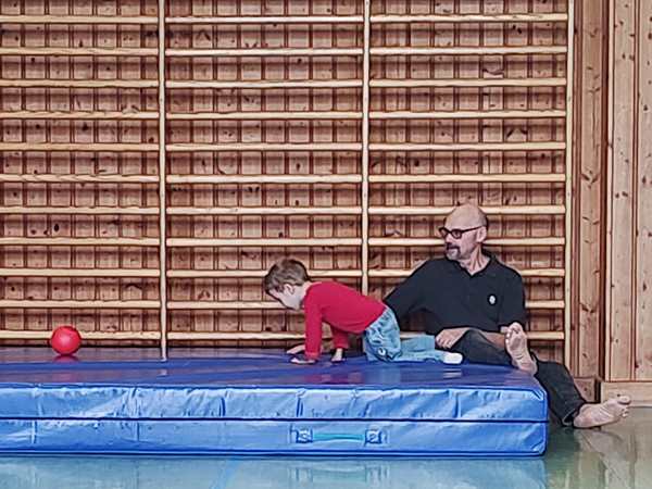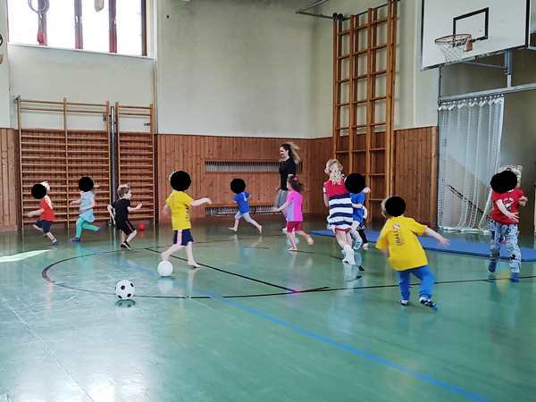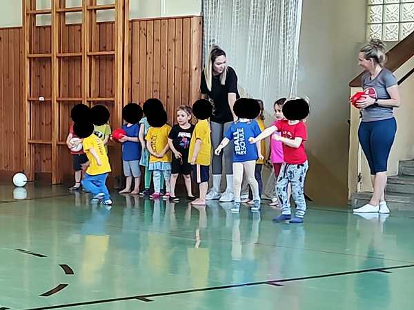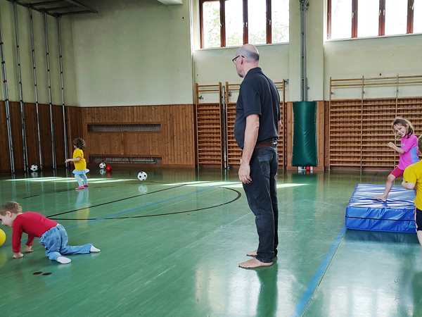 Then they set up a parcours, a big circle, with all kinds of equipment, and the kids went round and round having fun. They jumped and balanced and threw balls. And then the class was already over. While they shout "sports is fun" in their other exercise class, they shouted "ball school" in this exercise class.