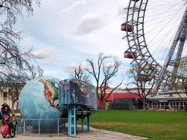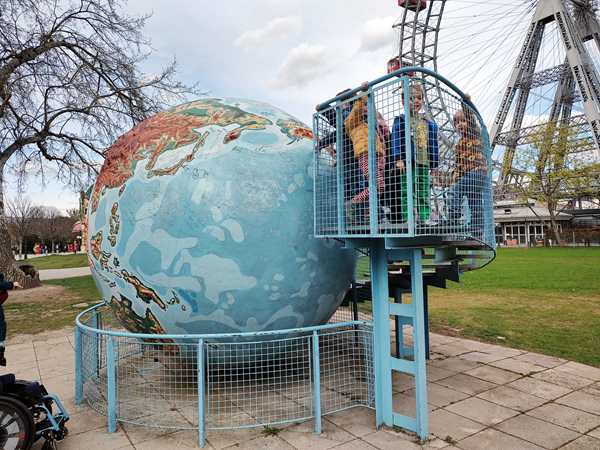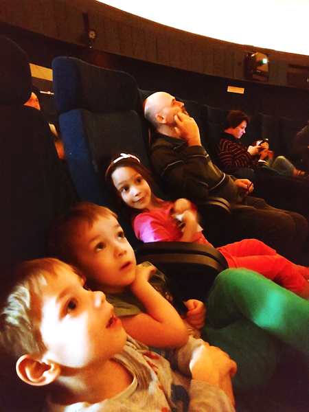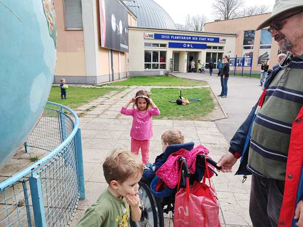 Day 1676. I started the day with a student at 10 am, then I had to cook lunch. I had another student at 1 pm, then we got everyone ready to leave the house. We rode the subway to the Prater, the famous amusement park in Vienna, and walked to the planetarium that is right there. They played with the moving globe outside, while I went inside to get our tickets. Then we lined up to get in. We've been there once before, and they had enjoyed it. Unfortunately that was not the case today. They were bored and kept asking, when the movie starts, but there was no movie. It was a teaching on the planets of our solar system - made for kids - and I thought they had done good job. Sammy was sitting with his siblings or me or Daddy, moving around way too much.