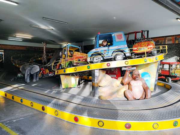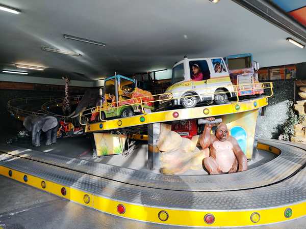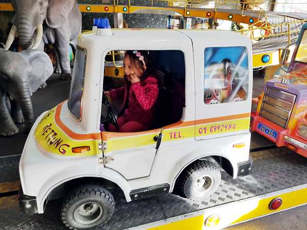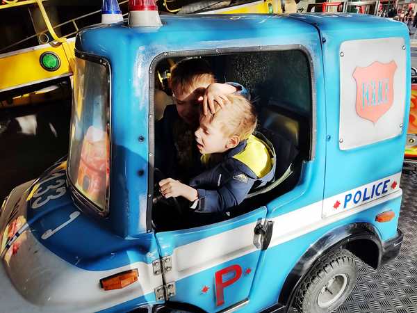 The kids were upset that there had not been a movie. We left and started walking through the amusement park to the subway on the other end. I told them they could do a few rides. All three got on a train, Emmy sitting next to his brother, and they loved it. Sammy cried hard every time a ride ended, as he wanted to go on.