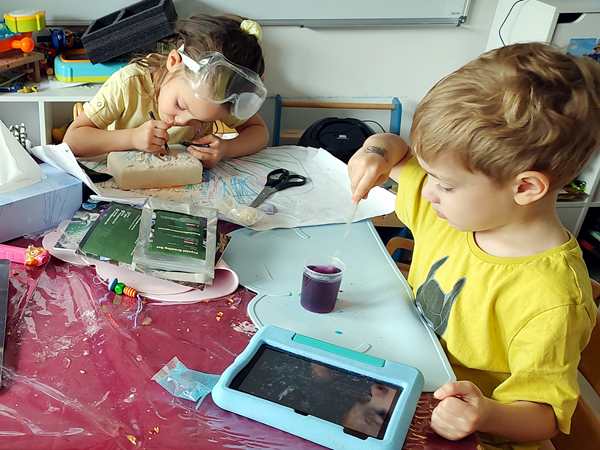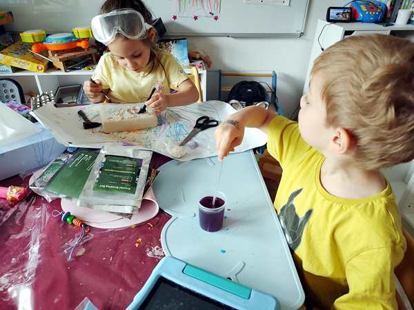 I don't know how it came up, but Tammy had still not dug out her precious stones out of the block of clay she had received as a gift at Easter, and she wanted to do it. I needed a break from work anyway, so I got the stuff and set it all up for her. She had to dig and also had a brush to brush off the dirt. There were 12 gemstones hidden in the block, and a few of them became visible quite quickly. There was also a crystal-growing kit included, and so I did that with Emmy. I got some hot water, then Emmy stirred it as I poured in the powder that would be the substance the crystals use to grow. We set it on a shelf, and now we just have to wait and watch.