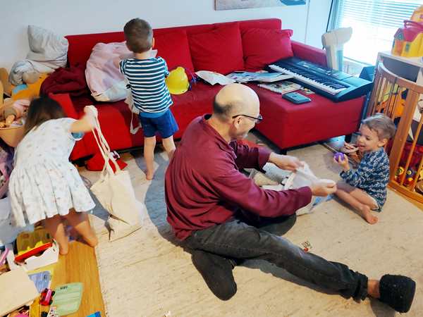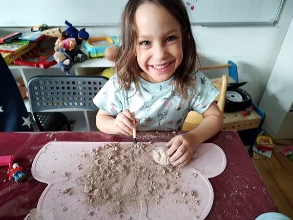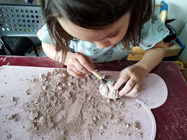 But the kids never let me sleep, unfortunately. They woke me up a few times, when I was finally able to sleep well after having taking some medication. They have received some eggs with fossils that you have to dig out, and they wanted to do so. Tammy and Emmy both started, but Emmy didn't have the perseverance for it and soon quite. Tammy finished hers and got a dinosaur out.