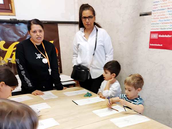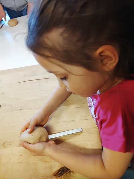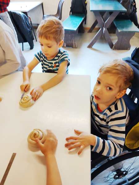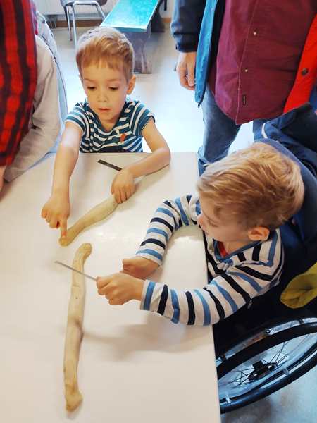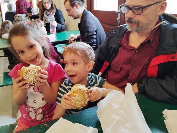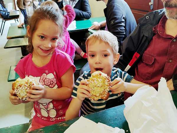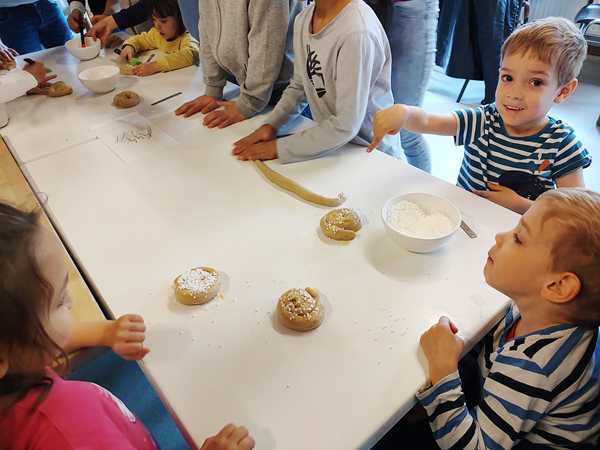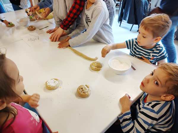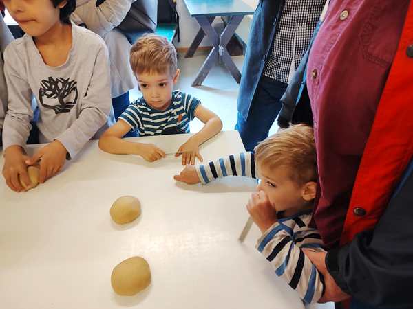 First the kids had to take out a metal rod of the bag. It had the same number on it as the paper bag and was so they'd know whose was whose at the end. We also had to write their names on the bags. Then she collected the bags and handed out dough to everyone. She then led them step by step as to what do do. They had to roll the dough so it'd be really long, then roll it up. Then she gave us egg yoke to brush on top and sugar to put on top. Then it was done. She put them all on the baking trays, while we were waiting for her to finish so we could start the tour. The kids were impatient, of course.