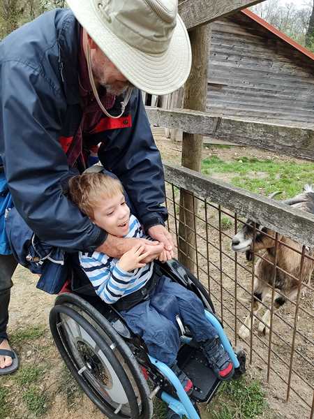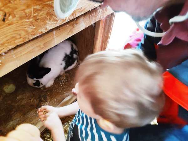 We first went to the rabbits and were allowed inside their house thanks to our guide. We had some feed, but not carrots, like some people had brought with them. But they got to pet one rabbit in particular and saw a few others as well. Then we went to the cows. They were two baby cows there, and the kids looked at them. Randy got Sammy out of the wheelchair and told me that the calf had kissed Sammy.