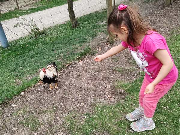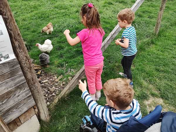 We walked by some ducks and got to the sheep. Our guide had a big bag of animal feed, so the kids kept going to her to get some. Emmy has now also lost his fear of feeding animal. There was one baby sheep that everybody wanted to feed. Then we walked on and went inside the chicken's big area. Here Emmy was afraid again, and both of them did not like the chicken dung on the ground. We didn't stay in there for long, but went to the scoop where you could look at the babies. Then all three stood outside the fence to look at them.