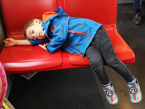 We walked back to the bus stop and had to wait a little for our bus to arrive. After the bus, we got on a subway. Emmy lay down on the seats and fell asleep. I then picked him up and carried him, when we got off and walked to another subway. However, he's really heavy now, so Randy took over. We got on the second subway, and soon Emmy was awake again.