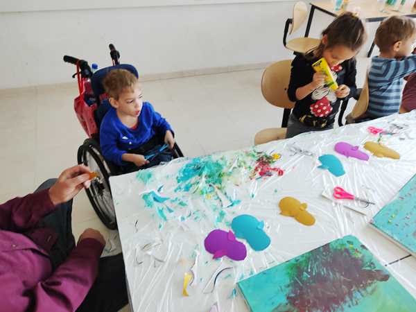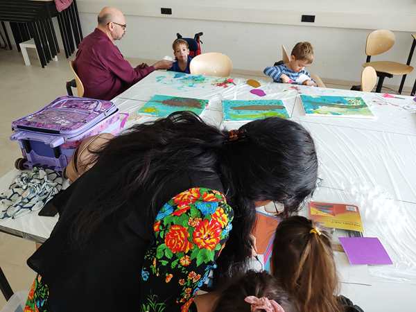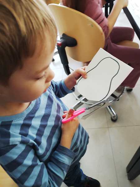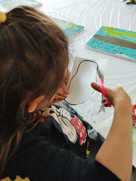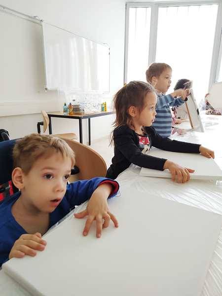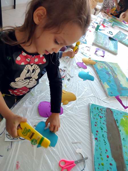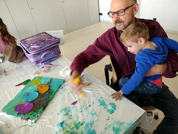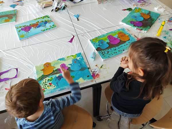 After all the kids had removed the plastic of their canvasses, she put three different colors of paint on each one and gave everyone a brush to distribute the colors on the canvas until all the white was gone. I helped Sammy, and he did a great job. So did the others. It was the background of our "three birds on a branch" artwork. Then she put brown paint on all the canvasses for the branch. Next they were given yellow and red pain to put some blooming petals on the tree. Sammy kept playing with the plastic protecting the table, trying to tear it apart, and he smeared the paint in his face and on me. He did not like it, when I told him to stop destroying the table cover. He then asked for Daddy to come replace me. So I went outside to get him, and then we both ended up staying in the room, which was the best solution, as they had to cut out the birds and wings next and cutting is still hard for them. Tammy was having a hard time but did it. Emmy is behind in that skill, so I helped him out, as well as helping Sammy. After gluing the wings, eyes and noses on the birds, they glued the birds on their canvasses. Then the artwork was done. I think they've done a fantastic job. We were the first ones done, and the class had already gone 10 minutes overtime. We took the canvasses and left.