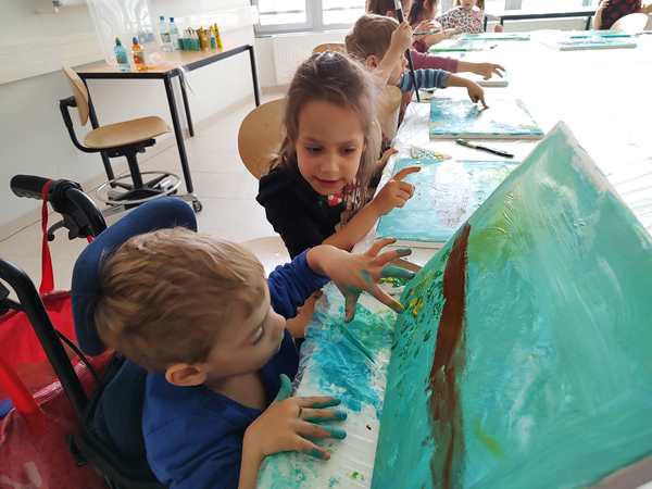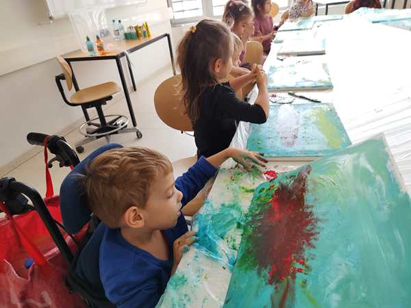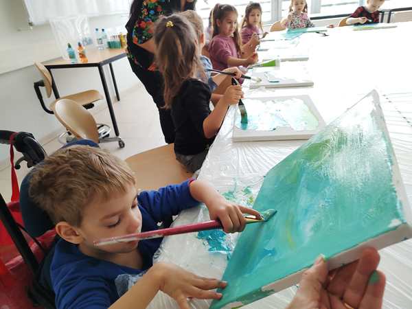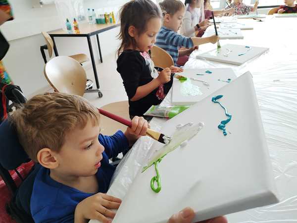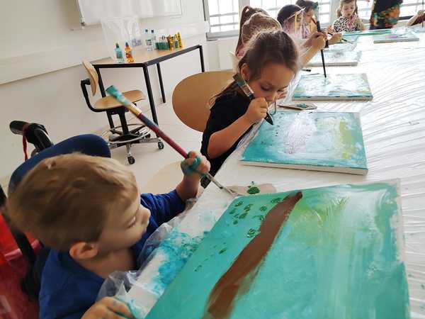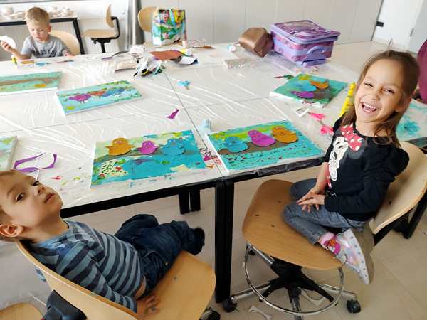 We got there early and joined the other two kids already in class. Just before 3 pm the teacher arrived who was a South American lady. There was also a good number of other kids who still arrived. We had already sat down at the table, paid the fee for the materials, and she handed out canvasses to all the kids. All the parents except for me had to leave the room. Randy stayed outside the room, sitting on the floor, where we could actually see him through the glass doors.
