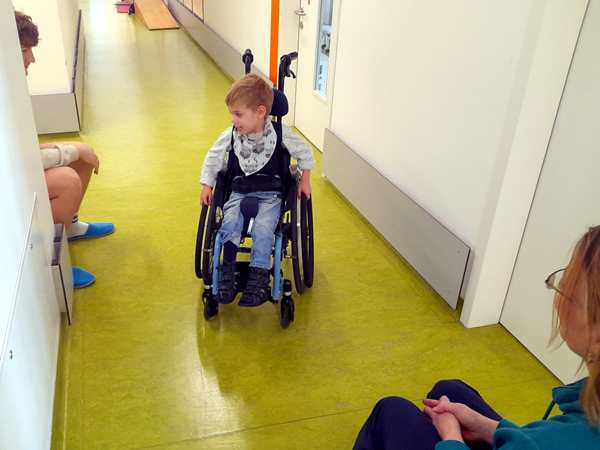 Day 1705. The past two days have been pretty busy. Yesterday I taught from 10 to 12, then Randy left to go pick up Sammy from kindergarten. When he got there, he was in his wheelchair, and the physiotherapist was working with him to learn to steer his wheelchair. Randy took a picture. By 12:40 they were home and I then had 90 minutes with Sammy as Randy left again right away to pick up the other kids from kindergarten. They returned home at 2:15 pm, and at 2:30 pm I had a student. After I was done, I dressed Tammy and Emmy for their dance class, and Randy left with them at 3:45 pm to take them to their class. Sammy and I then had another 2.5 hours together, and they were pretty long. He was whining for Daddy at one point, but I was able to distract him and start playing with him again to make him laugh and have fun. He was so happy, when they finally returned home around 6:15 pm.