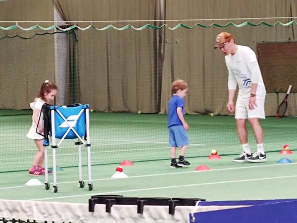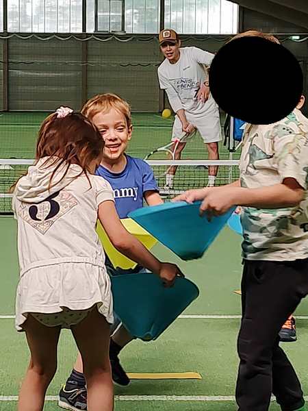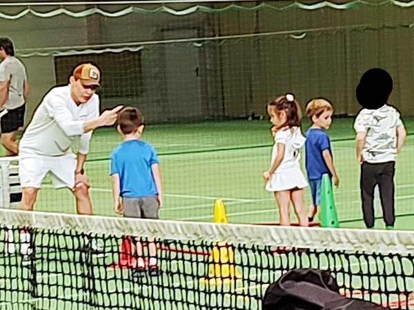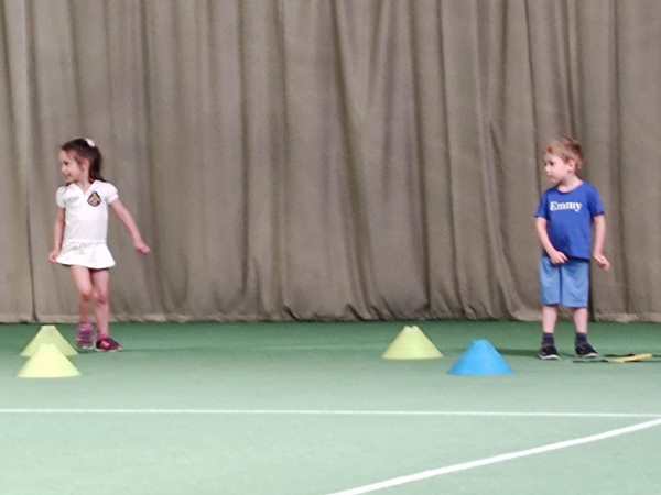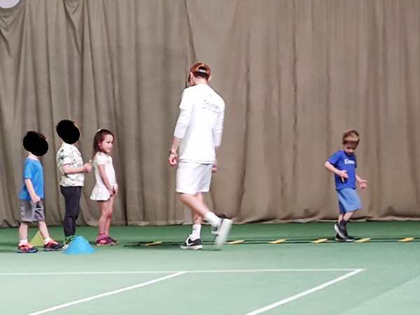 After a few rounds, he gave them cones and had them try to catch as many balls as possible, the balls that he was throwing to them. They had lots of fun. Then he had them come one by one again and try to hit the ball he was throwing to them, but this time they had to move and hold the racket differently. I was sitting in the restaurant, right where I could see them best, and watched through the glass, as well as taking pictures. In the end, they all stood by the net with their rackets in front of their faces, and he threw balls to them that they had to hit. Then the class was over. I was surprised, when they each received a piece of candy.