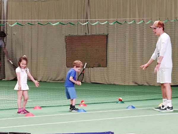 The reception was right there, and the guy there gave me a locker key in return for me giving him my house key. We then went upstairs to look for the locker room and we eventually found it. I had brought their sports clothes with me, and so they changed. Then we had to find the tennis courts. We went back downstairs and ended up in a restaurant. And then we could see the courts. One guy had a tennis school T-shirt on, and there were mothers with little kids watching through the glass, so I figured we were in the right place. It was still 5 minutes until 2 pm.