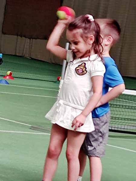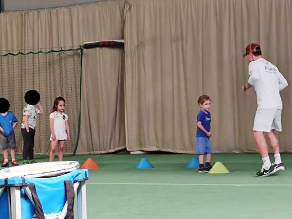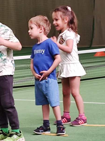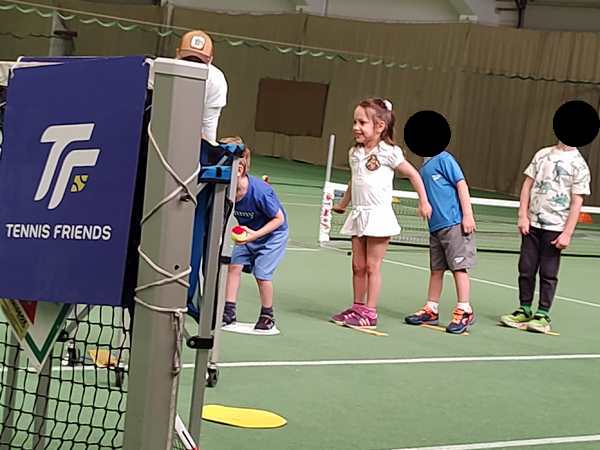 Then he gave them all tennis rackets and showed them how to stand, how to hold the racket and how to move it, when the balls come. He then played a few balls with a kid before moving on to the next kid. After one was done, they had to go through the whole parcours again and then line up behind the others to play with the teacher again.
