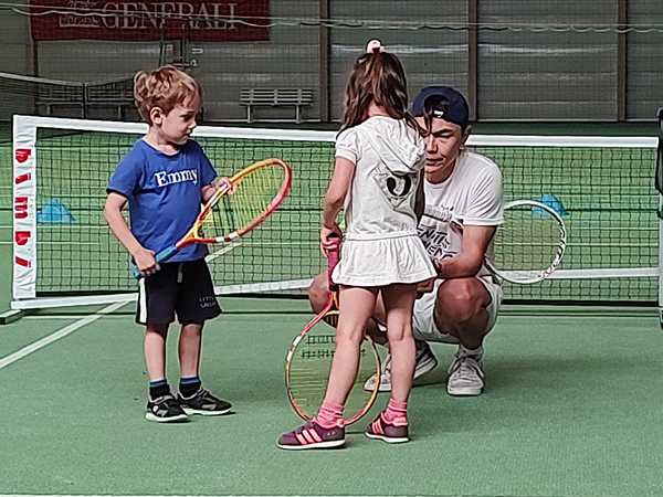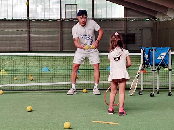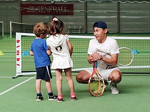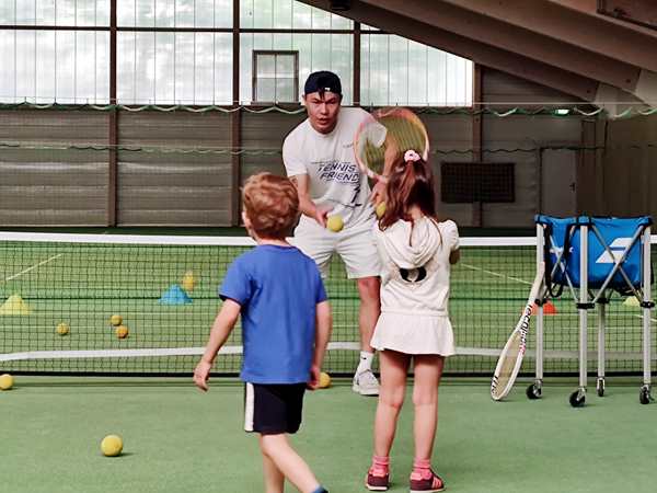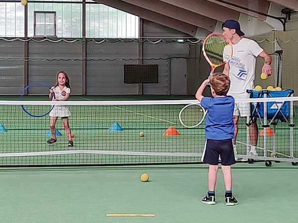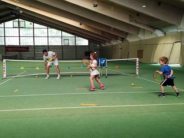 When we walked into the restaurant that you have to walk through to get to the tennis courts, I was surprised how empty it was. Neither did I see any other kids or parents. There are two other boys in their class. But not today. It was only the two of them, which was nice for them. The parcours the teacher set up was only half as long. He made the kids hit balls with their rackets and made them run left and right. One time he had one kid on one side of the net and the other on the other, and one kid had the tennis racket and the other a hoop. He'd throw a ball to the kid with the racket who had to hit it, and the other kid had to try to have the ball fall through his hoop. Their success was limited.
