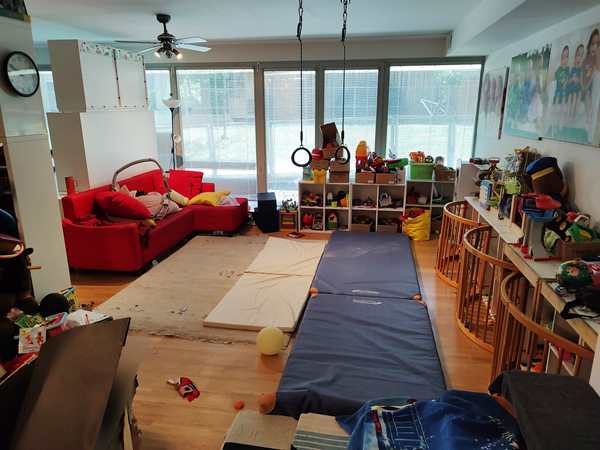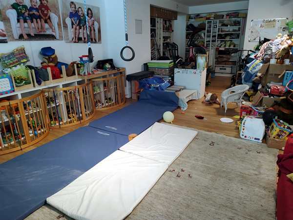 Day 1724. Randy took all three kids to their kindergartens, so I lay back down, as I was very tired. I fell asleep and was woken up by my phone ringing, as the cleaning lady had arrived at 9 am and was wondering why I wasn't reacting to the doorbell. So I only got to sleep a few minutes. I started tidying up so she could do her job. She went downstairs first, into the chaos, to clean the floor where it was visible. When Randy returned at 10 am, he did some moving of shelves, making it look much better. At noon he left to go pick up Sammy and returned at 12:40.
