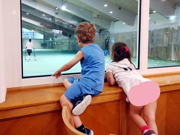 We went to the locker room, where they got changed, then we walked down to the restaurant, where I always sit and watch them.