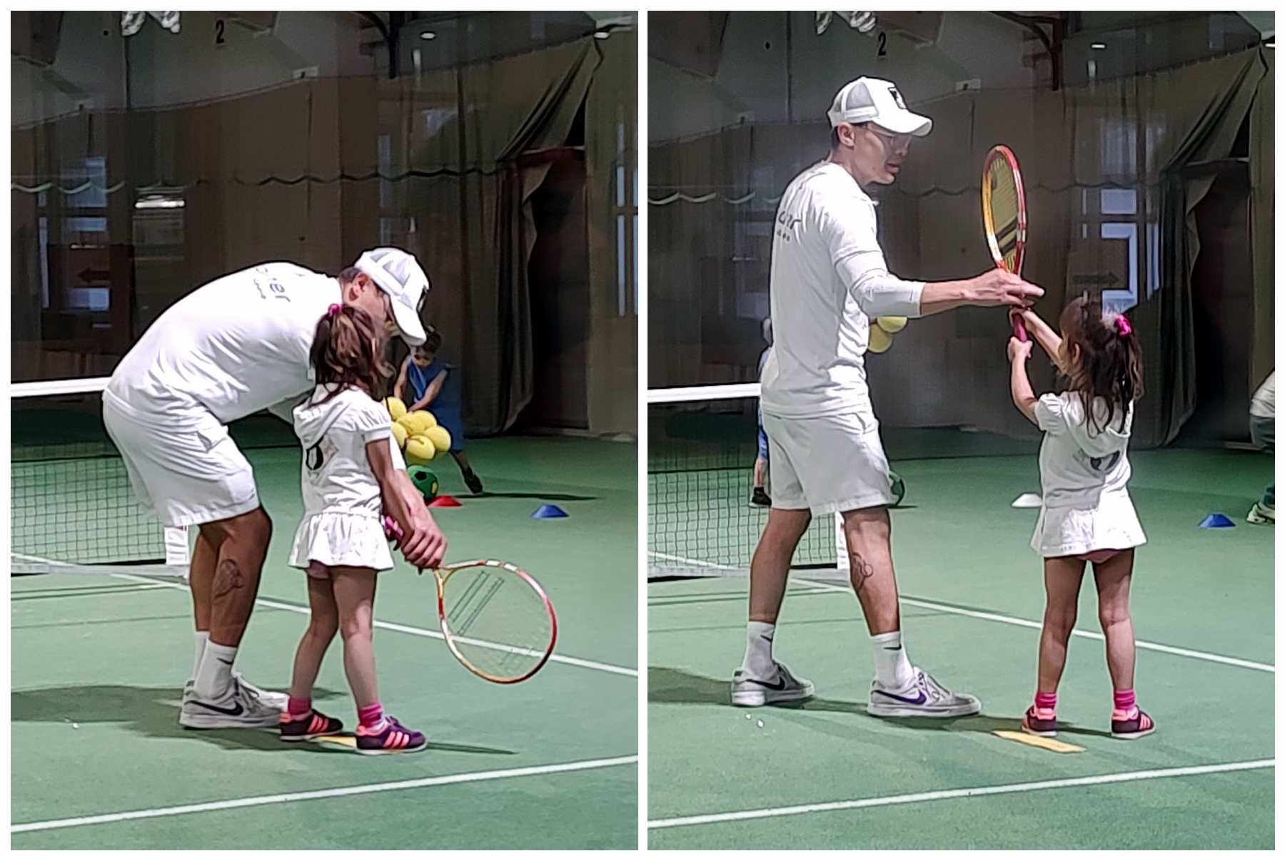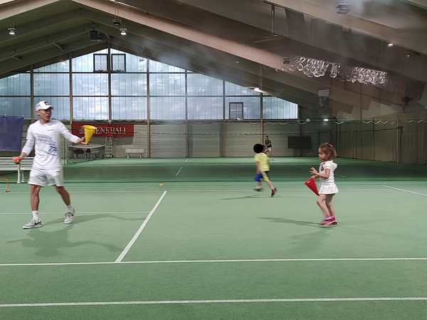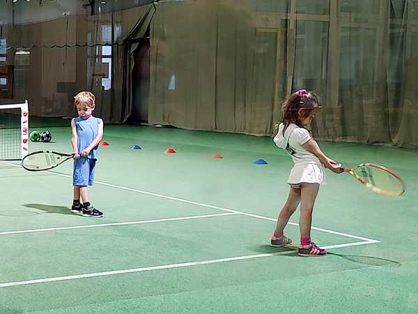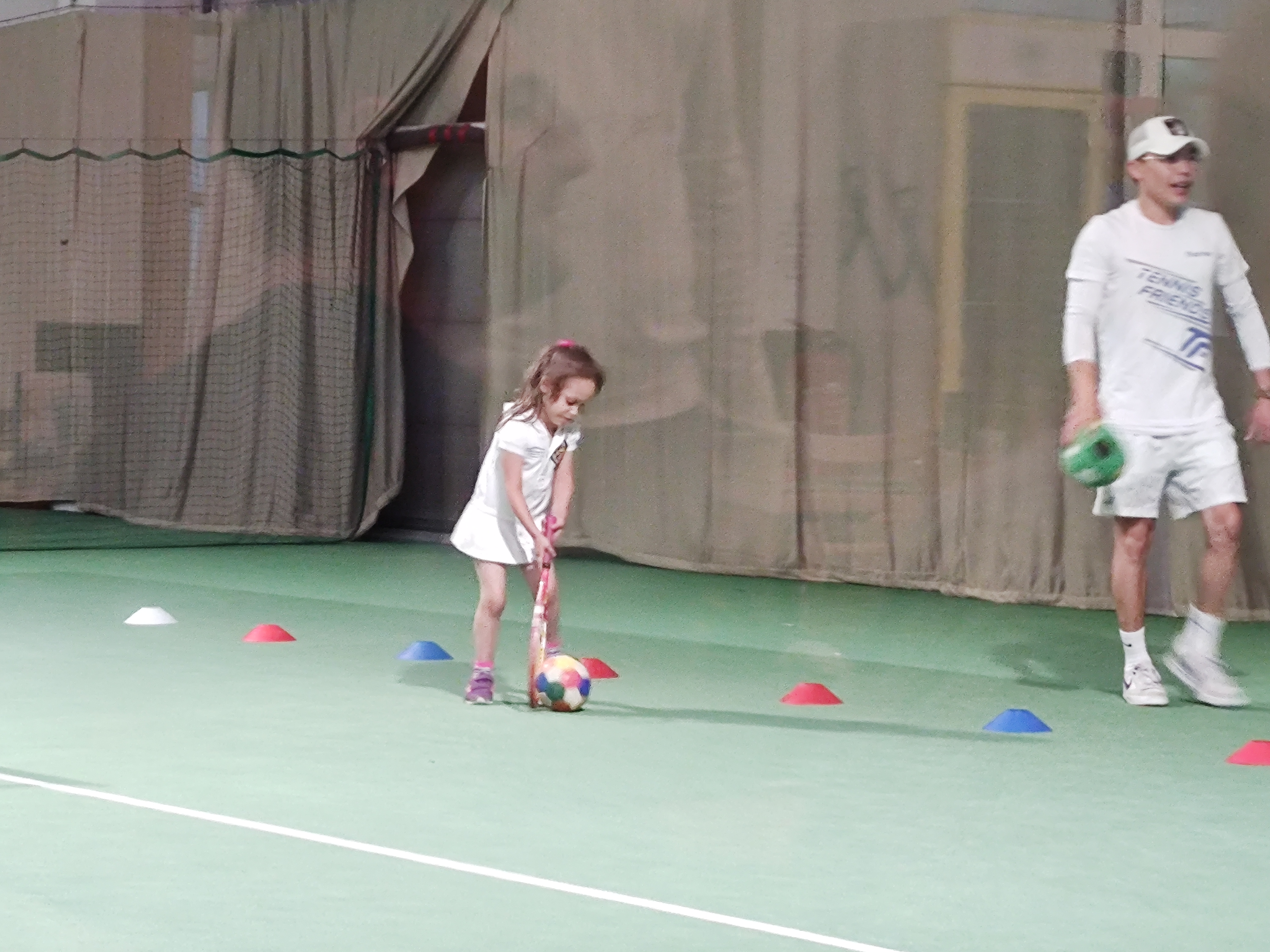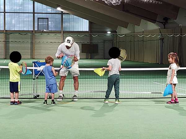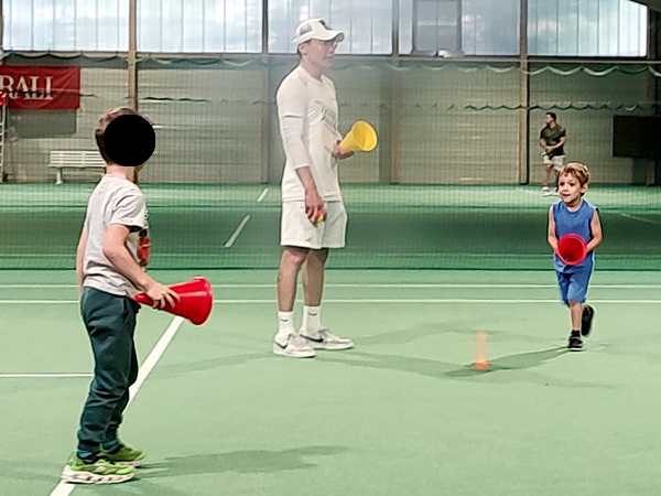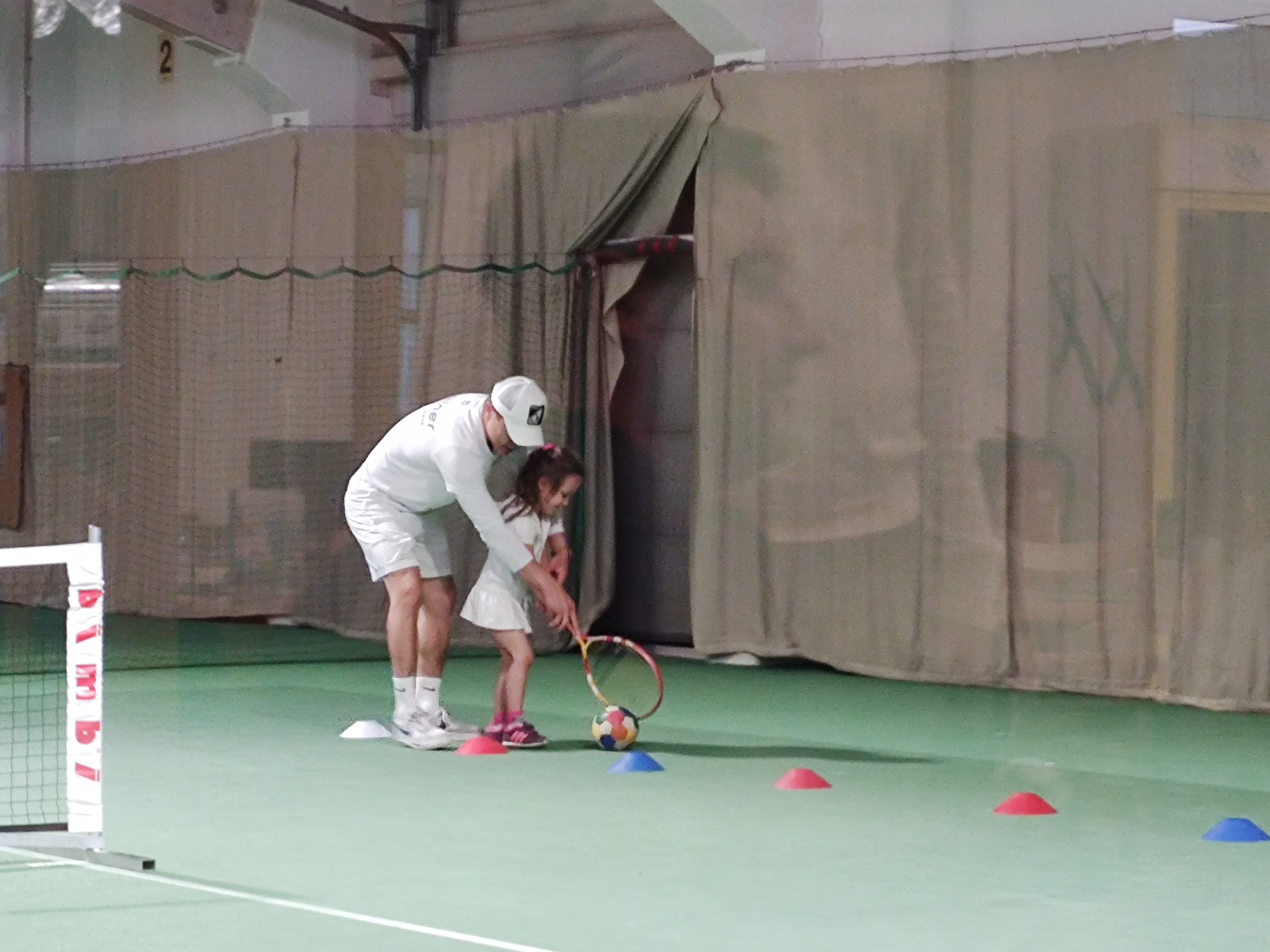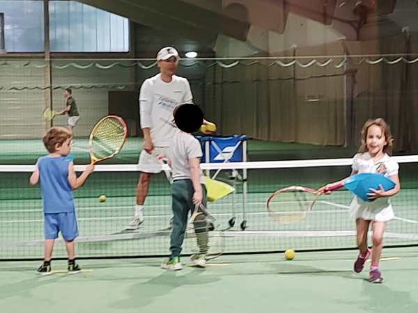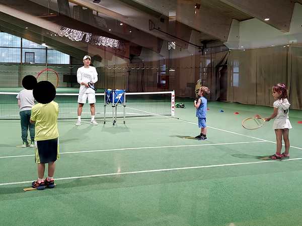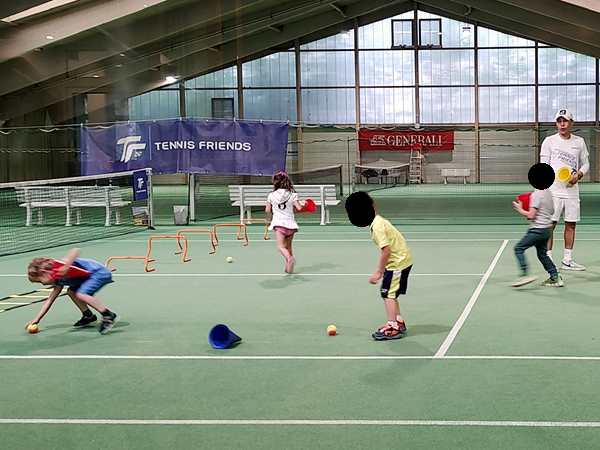 Then the teacher showed them how to use their rackets to move a ball on the ground through a slalom. Tammy was having a hard time. Then they were put on marked spots on the court, always two and two, and the teacher threw balls at them for them to hit. He showed them exactly how to hold and move their rackets today. It was the first time he did that. Tammy was having a harder time than her brother. Once two were done, they could do the parcours, while it was the other two's turn.