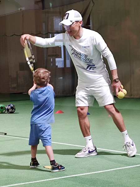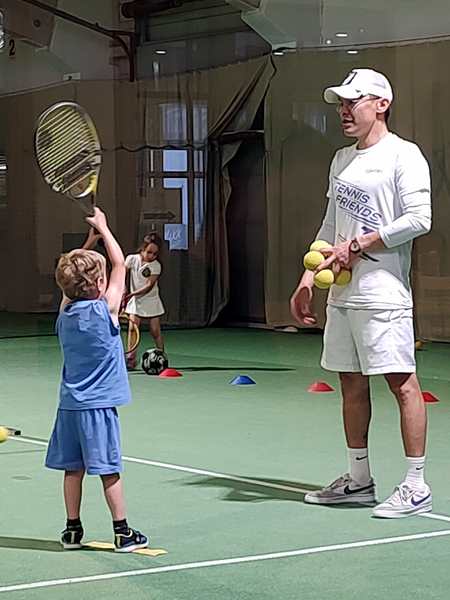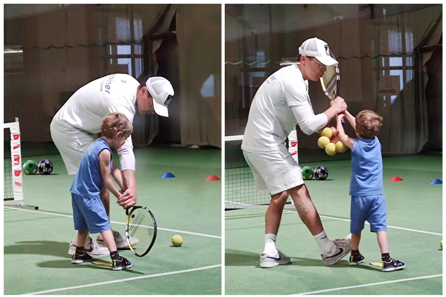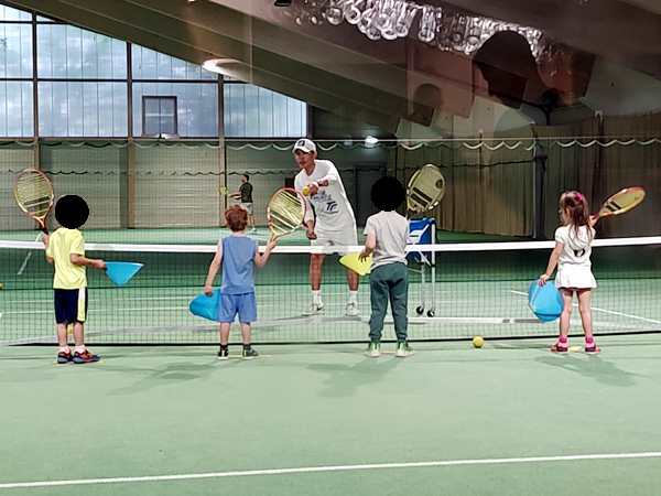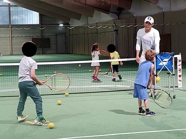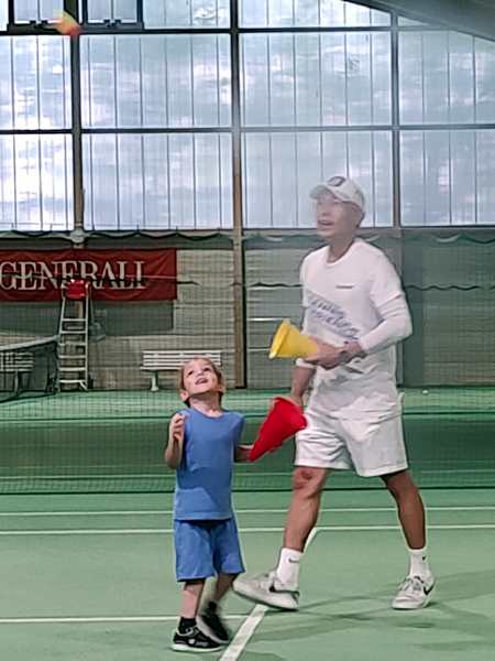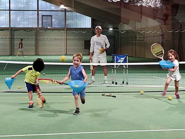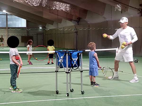 After a while, he changed it up and had two kids hold a hoop on the other side of the net, and those two needed to run to have the balls coming from the other two kids fall through the hoop. That was not very easy given that those balls were going every which way. Next he lined them all up by the net and they had to volley their balls straight over the net, which is somewhat easier. In the end he did a little game again, throwing lots of balls that they had to catch with their cones. And then 3 pm had already come, and the lesson was over.