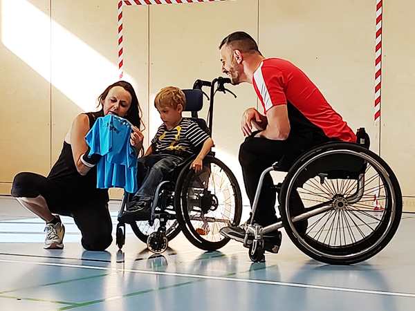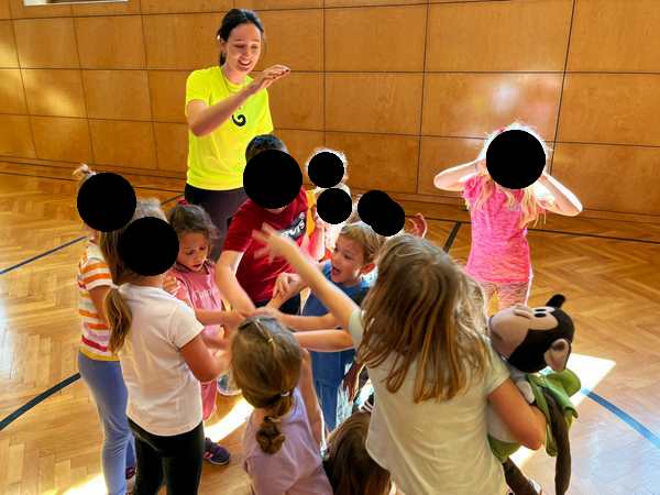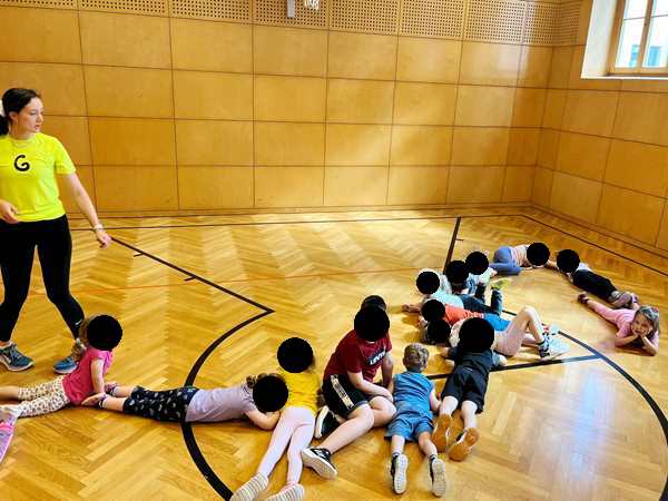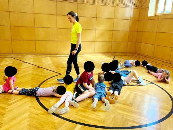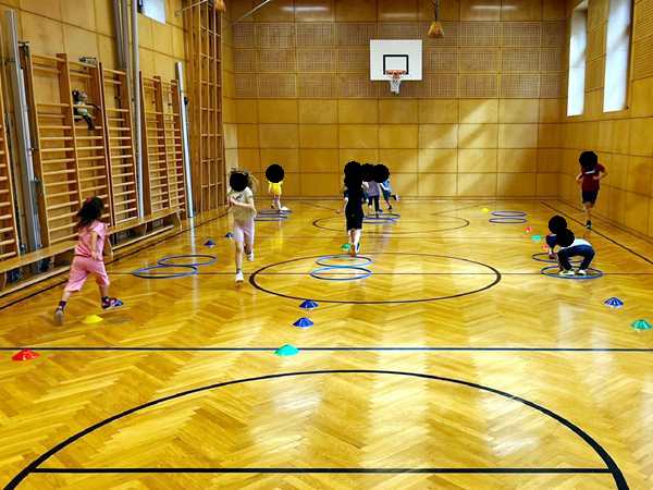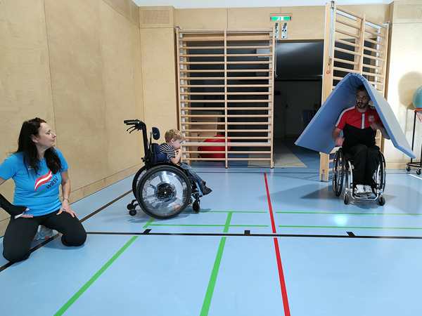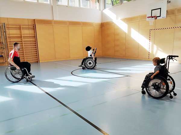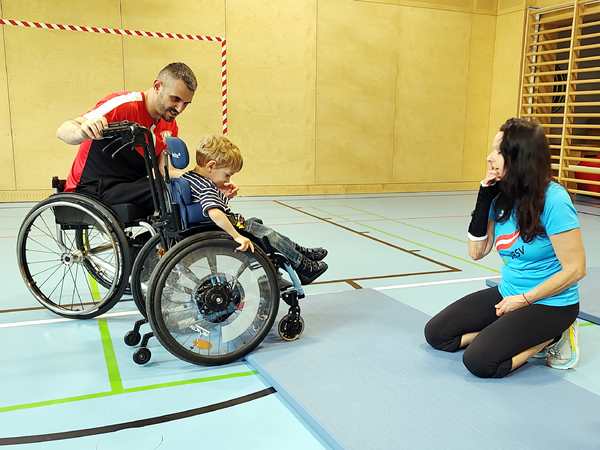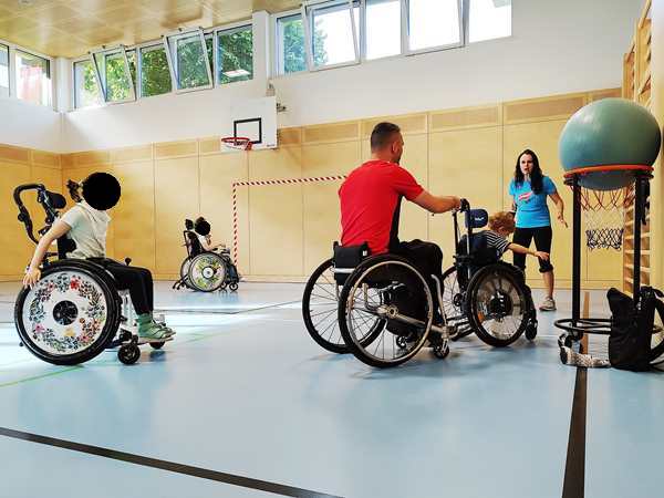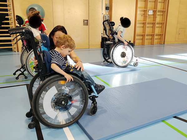 We took the elevator down to the gym and went inside. The third girl today was one I had not met yet. It was Sammy's third class today, and my second time there. I sat down on the floor against the wall to watch Sammy. He was not happy about his friend's absence and wanted to be with me and to go home. The teacher then offered me her wheelchair as she can currently not use it because of an injury. At first I said no, but then I sat down in it so that I could play with them all, which encouraged Sammy to also join in.