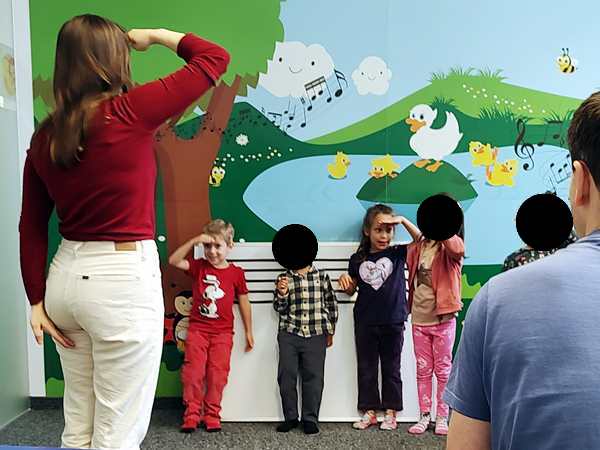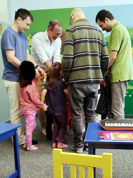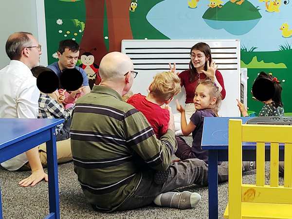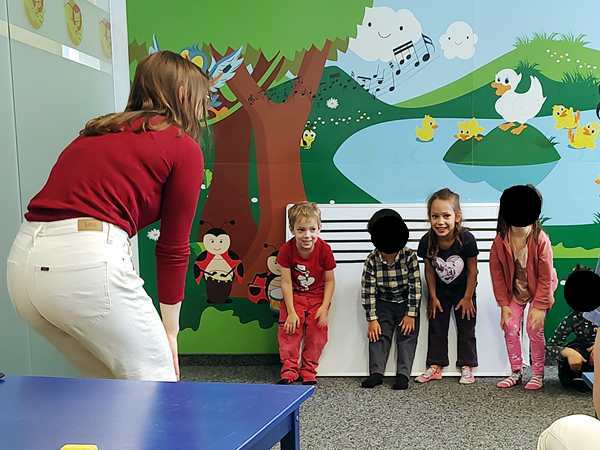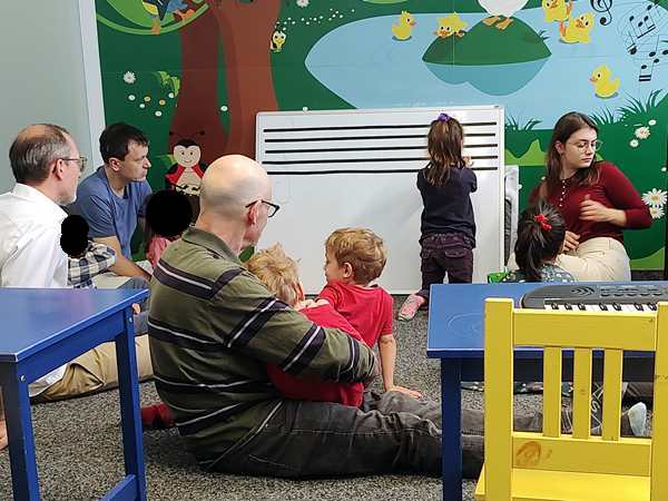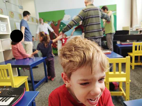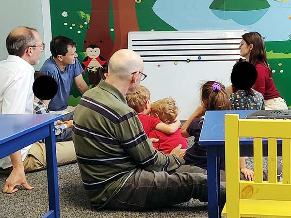 Sammy was with me most of the time and he was looking at pictures on my phone. The kids did some dances/songs in the front with Randy going with them, but they also sat by the board. The teacher drew the notes on the board, and they had to put the corresponding colors on the notes. Sammy left me and went to the front as well, ending up first with Daddy and then sitting next to his brother, arm in arm. In the end he also went up front during story time.