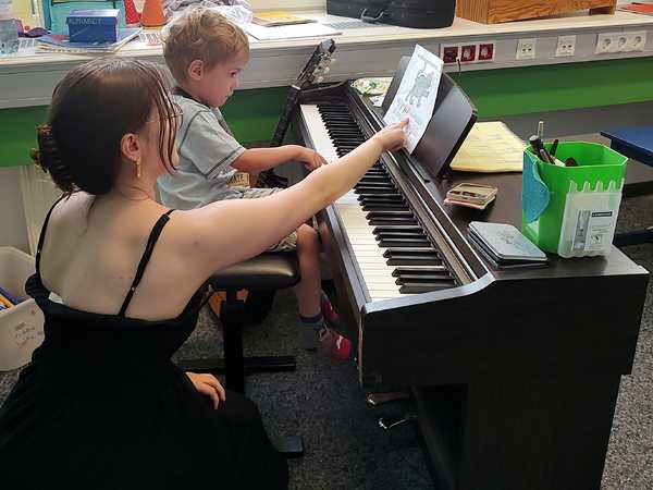 We rode the subway downtown and walked to the music school, where we arrived on time. There were more kids in class today that have ever come this class, some from another day probably doing a make-up class. The teacher did the welcome song, then gave the kids the colored stickers for the four notes they know, Do-Re-Mi-Fa, to put them on the correct keys on their pianos, which they can easily do now. Next she had everyone play the same song, then she got her list out to remember what song each one of them was doing. She asked who wanted to play their song in front of the whole class first, and Emmy's hand shot up with him shouting "me". And so he went up front to the real piano. She helped him onto the stool and then pointed at the notes so he'd know what to play. In fact, both kids play their songs by heart, but it might have helped Emmy after all since he played the song correctly. Everyone applauded, and Emmy bowed in front of everyone and then sat back down. The teacher actually had every kid first say what song they were doing, then sitting down by the piano. Tammy also played her song well.
