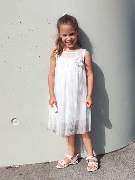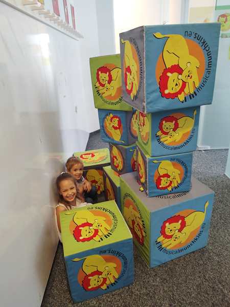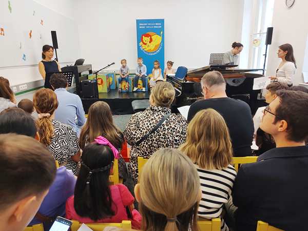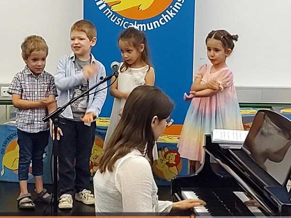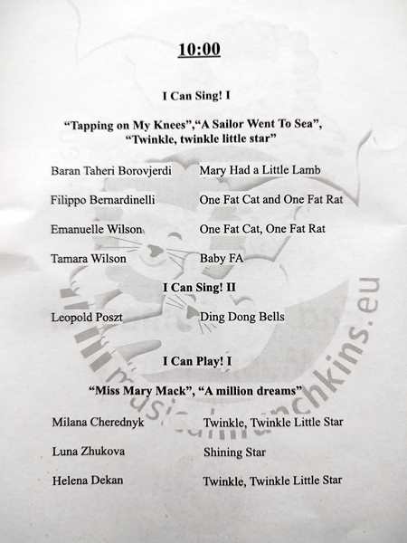 We'd found a beautiful, white dress among the clothes we were given that Tammy wanted to wear, and it was perfect for a concert. She looked so very pretty. We walked to the subway and took it downtown, then we walked to the kids' music school, where we were the first students to arrive at 9:25 am. The concert was to start at 10, and 9:45 was when we were supposed to be there. We were told to wait in a certain area, so they could continue setting everything up. While we were waiting, more students arrived, and some went into the classrooms and practiced their songs one last time. Our kids started building a cave with the cubes and had fun, while Sammy looked at books and had his tablet. Then we made our way to the big room where the grand piano was located and where the events were held. In reality the room was too small, and it was very crowded, everyone sitting on small kids' chairs. They had a second concert in the afternoon, so that half the students were at the first one, and the other half at the second one. We sat down in the last row by the door, as we had to leave at a certain time, and so that Randy could leave the room with Sammy if need be. We were given programs, where they had written the three songs they were singing, as well as what song they were playing on the piano. I noticed right away that they had misspelled Emmy's name.