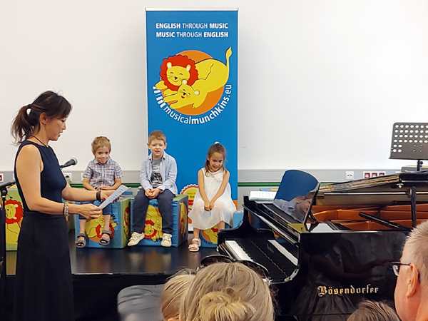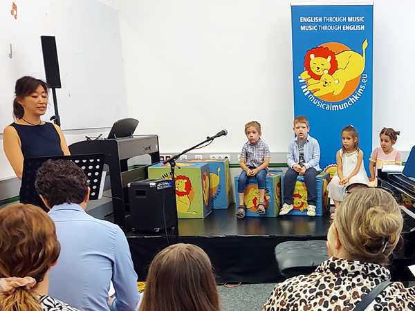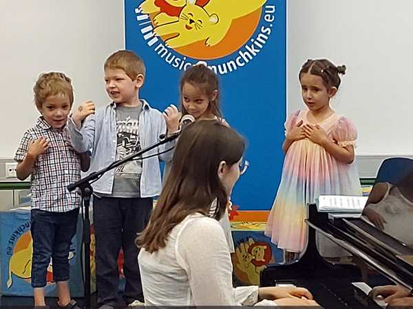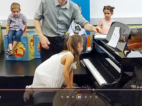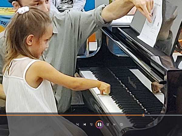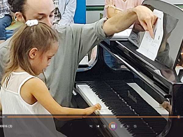 Then it was Tammy's turn. She jumped off the stage and climbed up on the piano seat and started playing right away, but the teacher helped her as she was not on the right key. But then she started playing sovereignly. Unfortunately she ended up on a wrong key and wouldn't take the teacher's cue to correct herself. Once she moved to another key, she was back on track, though, and finished her song correctly. She had actually played her song perfectly at home.